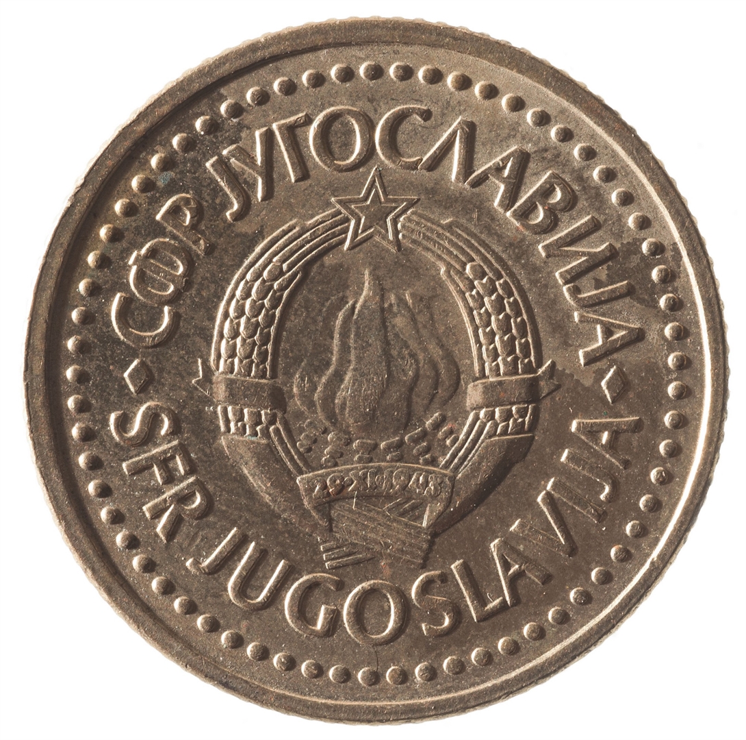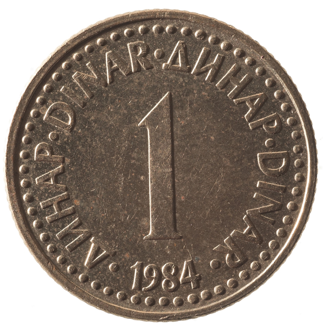 U sredini broj 1 (nominala), oko njega tekst DINAR na četiri jezika, a ispod toga godina 1984.