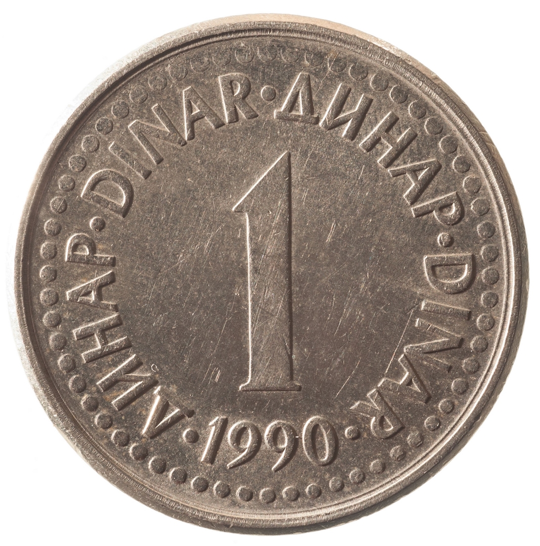 U sredini broj 1 (nominala), oko njega tekst DINAR na četiri jezika, a ispod toga godina 1990.