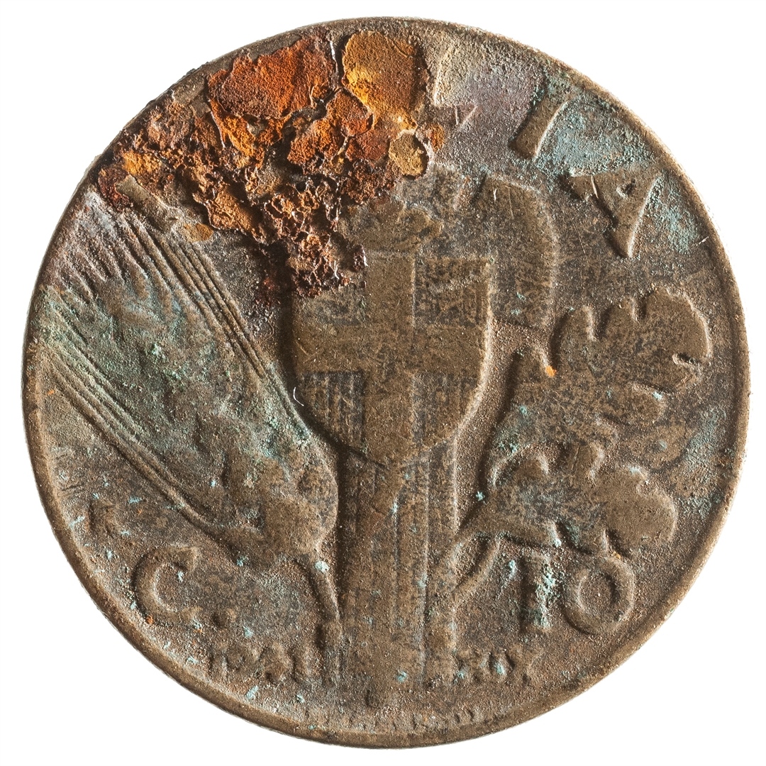 Centralno mjesto na kovanici zauzima fascio sa grbom. Iznad njega polukružno uz rub nalazi se natpis ITALIA, sa njegove lijeve strane smjestio se klas žita, a sa desne dva hrastova lista. Na dnu sa lijeve strane fascia nalazi se godina 1941., a sa njegove desne strane rimski broj XIX.