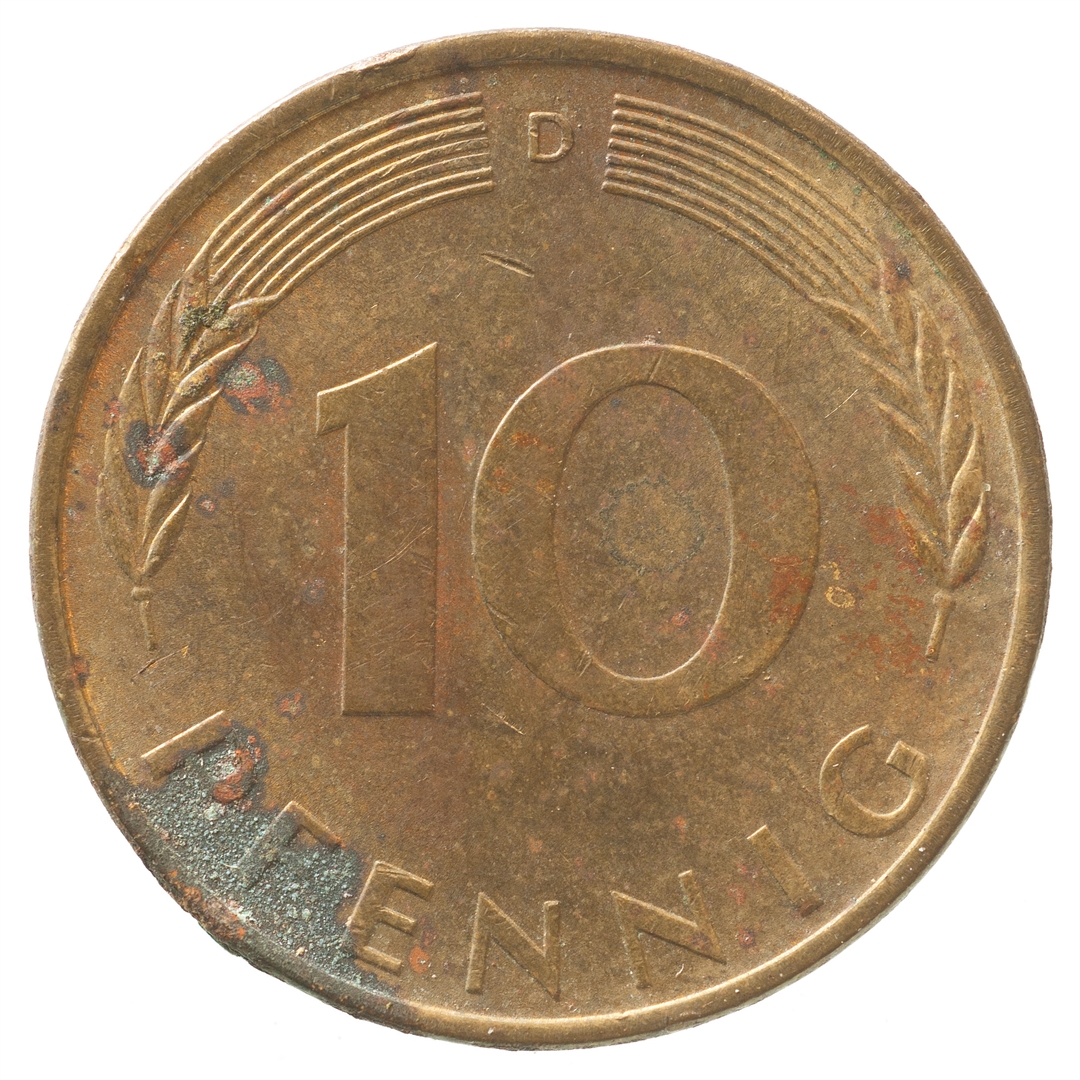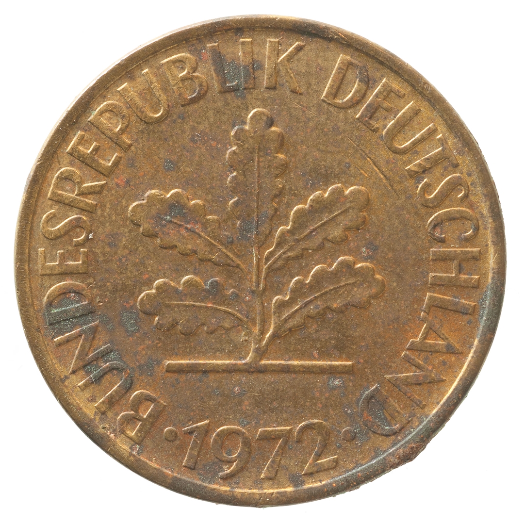 Avers: U sredini mladica hrasta s pet listova u vodoravnoj liniji. Uz rub ispisan tekst BUNDESREPUBLIK DEUTSCHLAND i godina 1972. Revers: U sredini broj 10. Na vrhu slovo D (oznaka kovnice), a uz donji rub riječ PFENNIG.