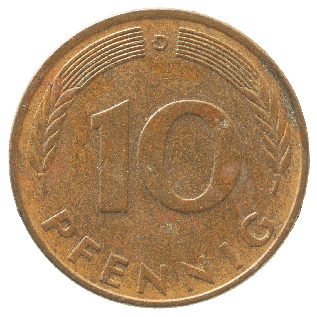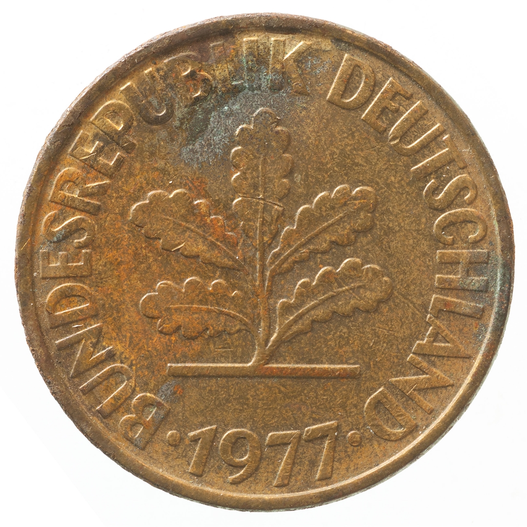 Avers: U sredini mladica hrasta s pet listova u vodoravnoj liniji. Uz rub ispisan tekst BUNDESREPUBLIK DEUTSCHLAND i godina 1977. Revers: U sredini broj 10. Na vrhu slovo D (oznaka kovnice), a uz donji rub riječ PFENNIG.