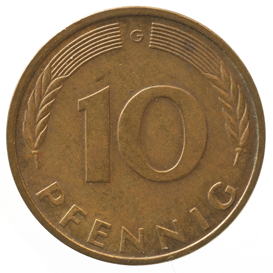 U sredini broj 10. Na vrhu slovo G (oznaka kovnice), a uz donji rub riječ PFENNIG.