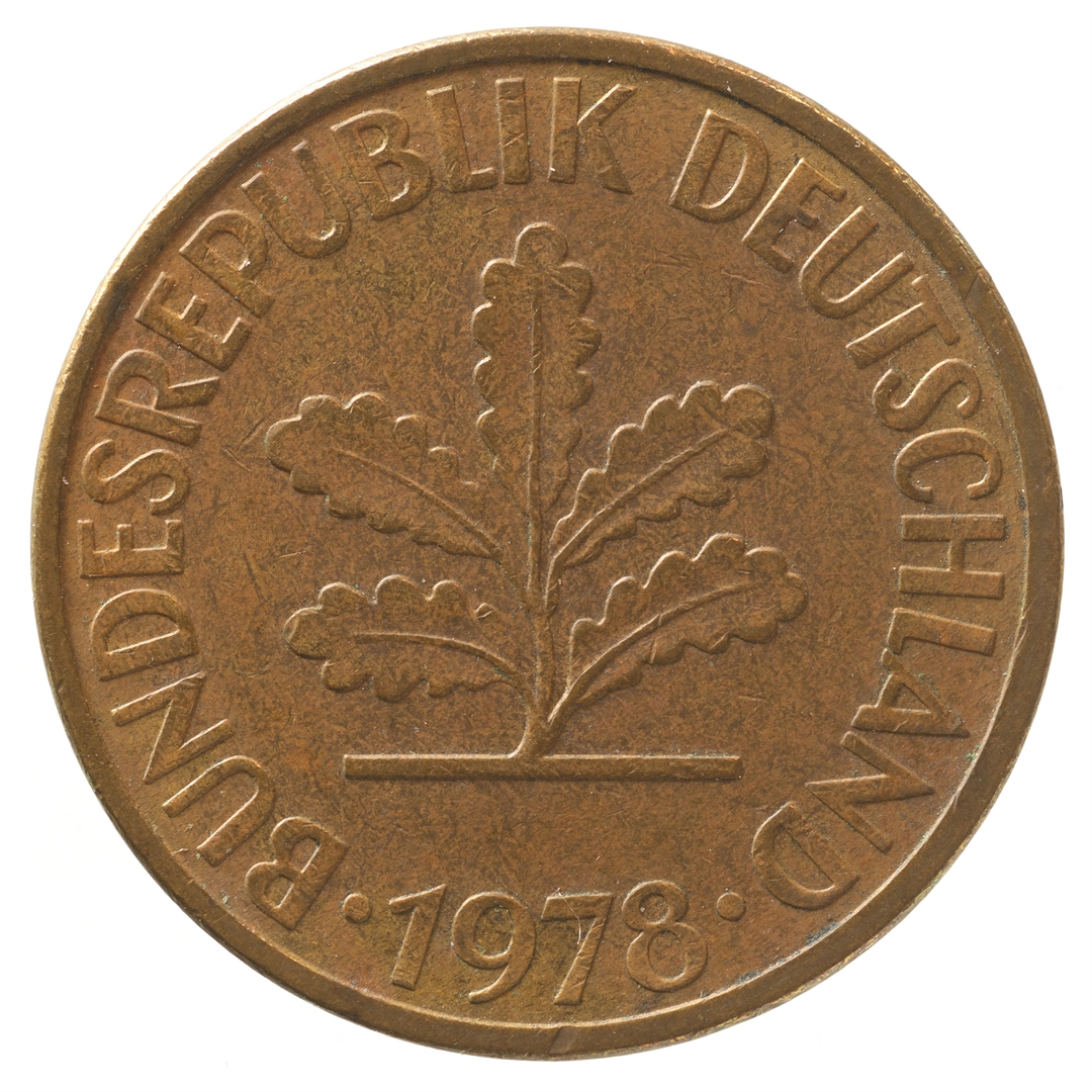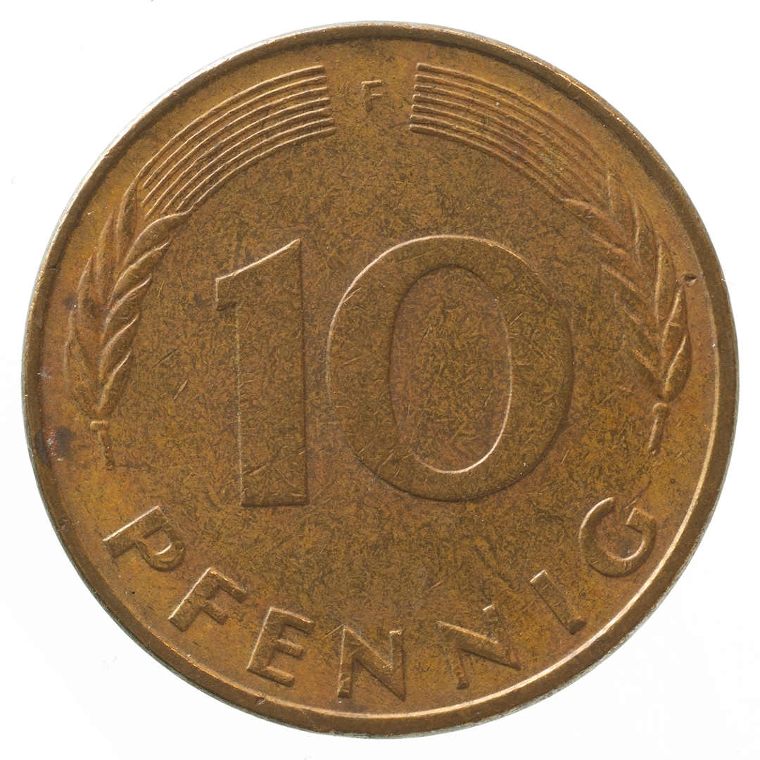 Avers: U sredini mladica hrasta s pet listova u vodoravnoj liniji. Uz rub ispisan tekst BUNDESREPUBLIK DEUTSCHLAND i godina 1978. Revers: U sredini broj 10. Na vrhu slovo F (oznaka kovnice), a uz donji rub riječ PFENNIG.