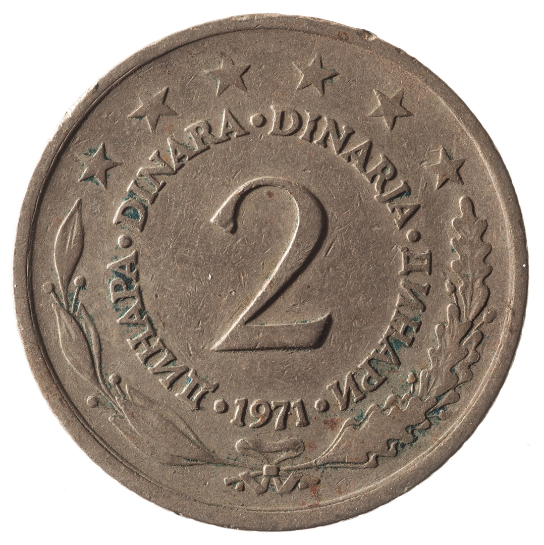 U sredini broj 2 (nominala), oko njega tekst DINAR na četiri jezika, a ispod toga godina 1971. Duž gornjeg ruba polukružno poredano 6 petokrakih zvjezdi.