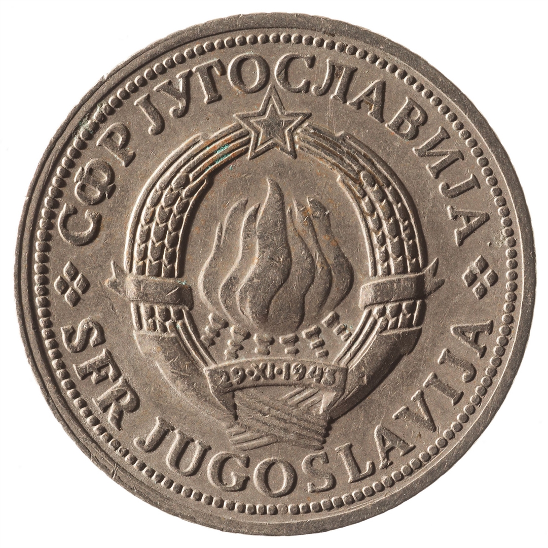U sredini državni grb. U oko njega uz rub polukružno napisan tekst SFR JUGOSLAVIJA na latinici i ćirilici.