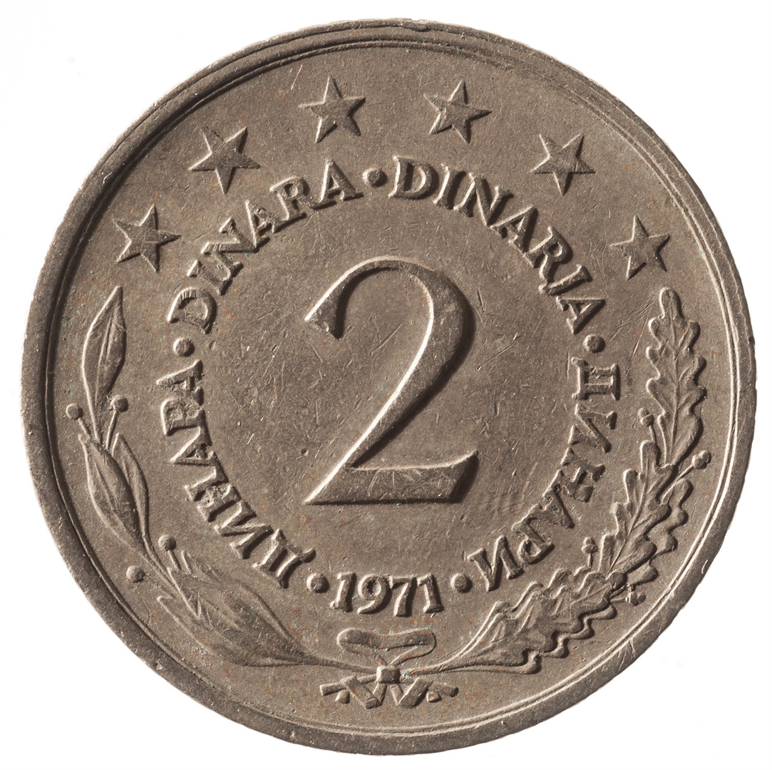 U sredini broj 2 (nominala), oko njega tekst DINAR na četiri jezika, a ispod toga godina 1971. Duž gornjeg ruba polukružno poredano 6 petokrakih zvjezdi.