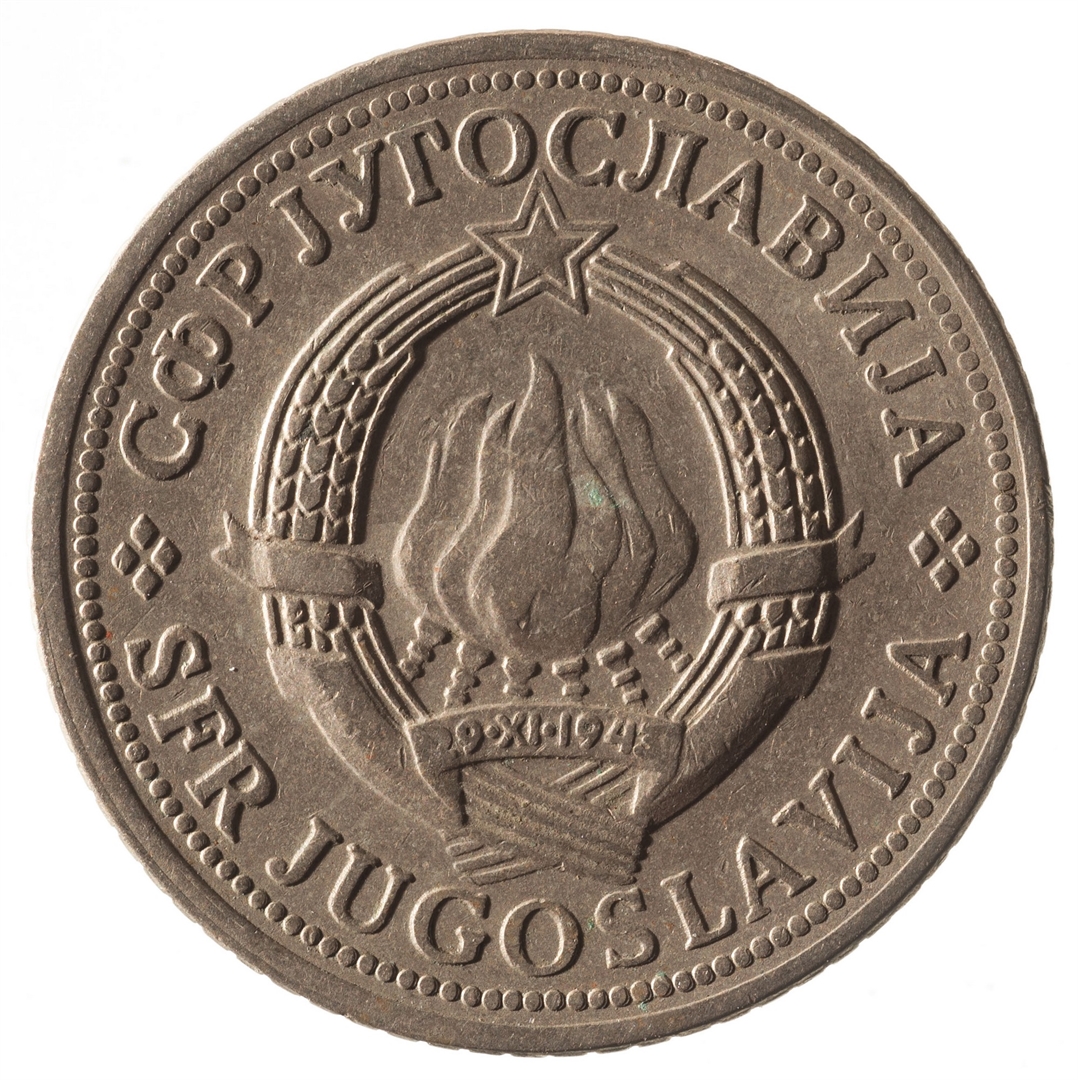 U sredini državni grb. U oko njega uz rub polukružno napisan tekst SFR JUGOSLAVIJA na latinici i ćirilici.