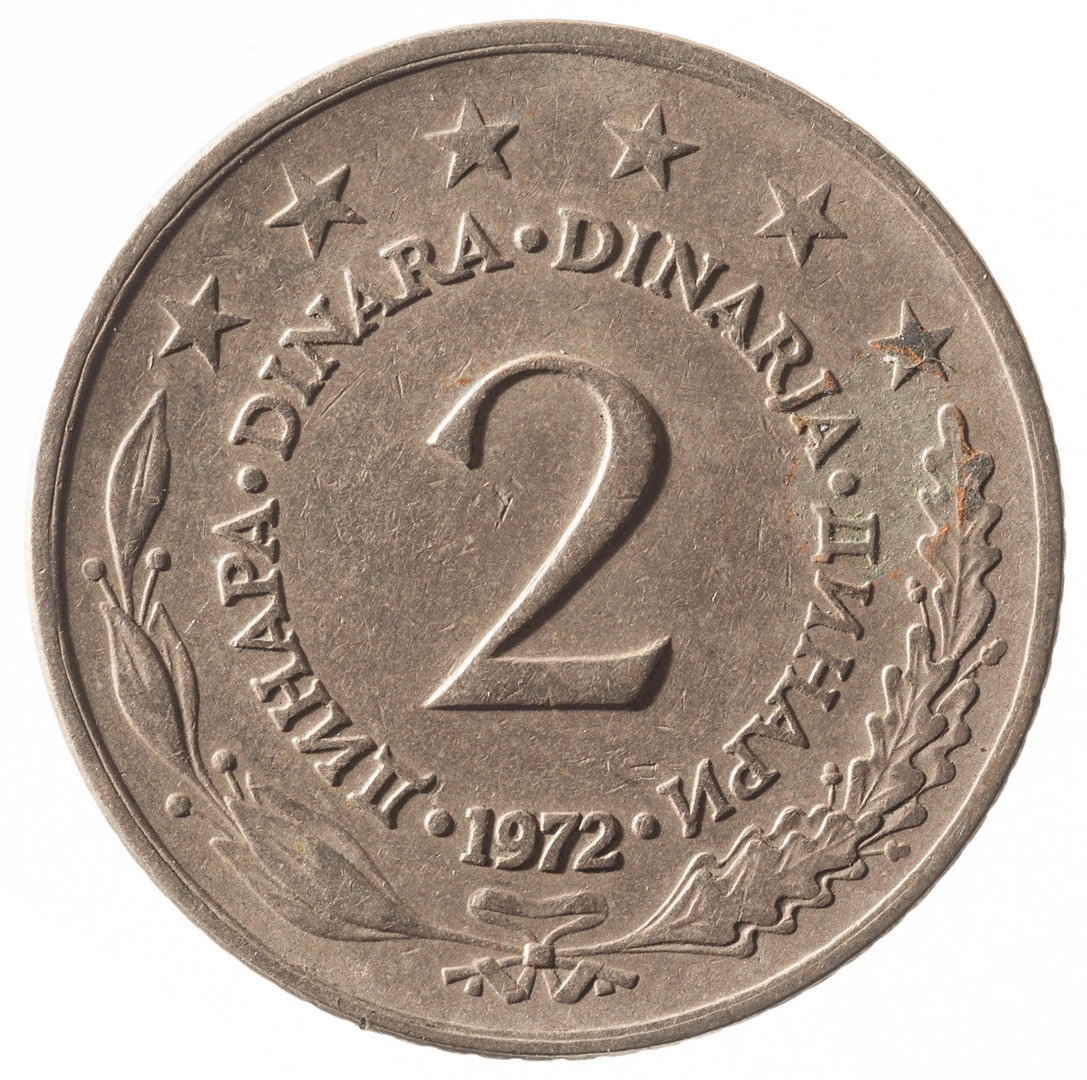 U sredini broj 2 (nominala), oko njega tekst DINAR na četiri jezika, a ispod toga godina 1972. Duž gornjeg ruba polukružno poredano 6 petokrakih zvjezdi.