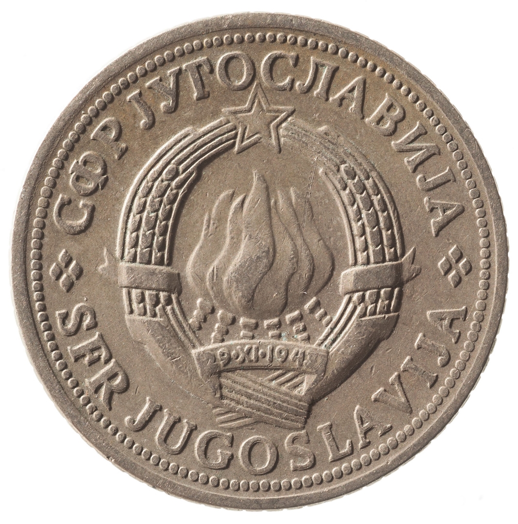 U sredini državni grb. U oko njega uz rub polukružno napisan tekst SFR JUGOSLAVIJA na latinici i ćirilici.