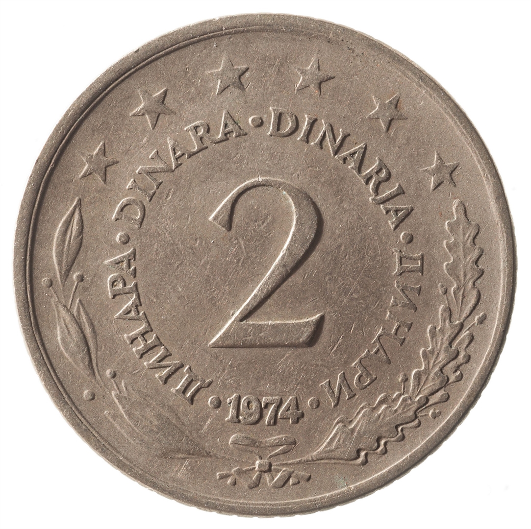 U sredini broj 2 (nominala), oko njega tekst DINAR na četiri jezika, a ispod toga godina 1974. Duž gornjeg ruba polukružno poredano 6 petokrakih zvjezdi.