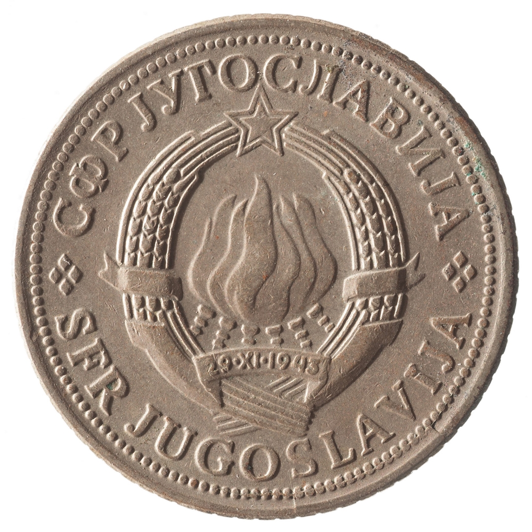 U sredini državni grb. U oko njega uz rub polukružno napisan tekst SFR JUGOSLAVIJA na latinici i ćirilici.