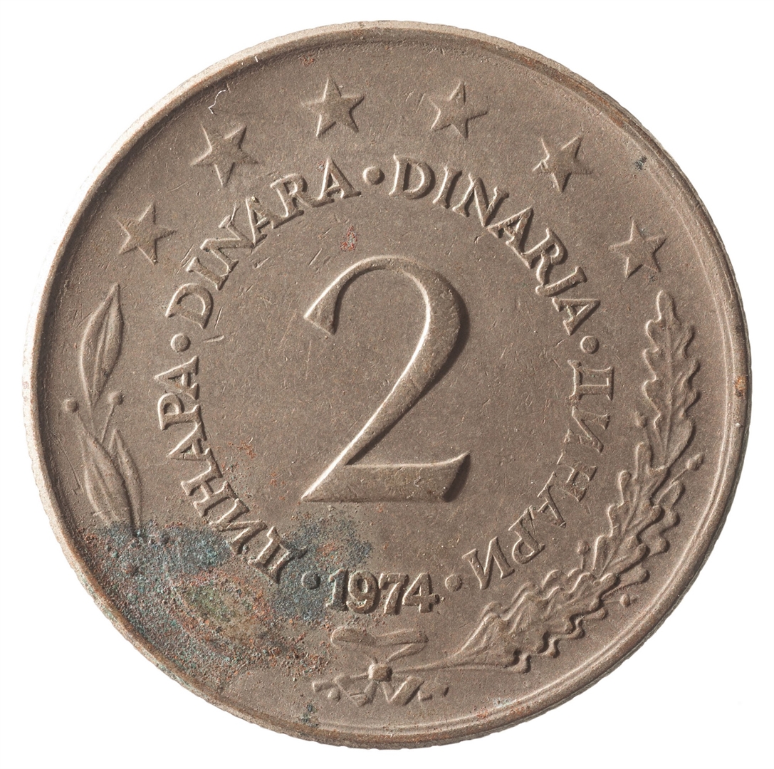 U sredini broj 2 (nominala), oko njega tekst DINAR na četiri jezika, a ispod toga godina 1974. Duž gornjeg ruba polukružno poredano 6 petokrakih zvjezdi.
