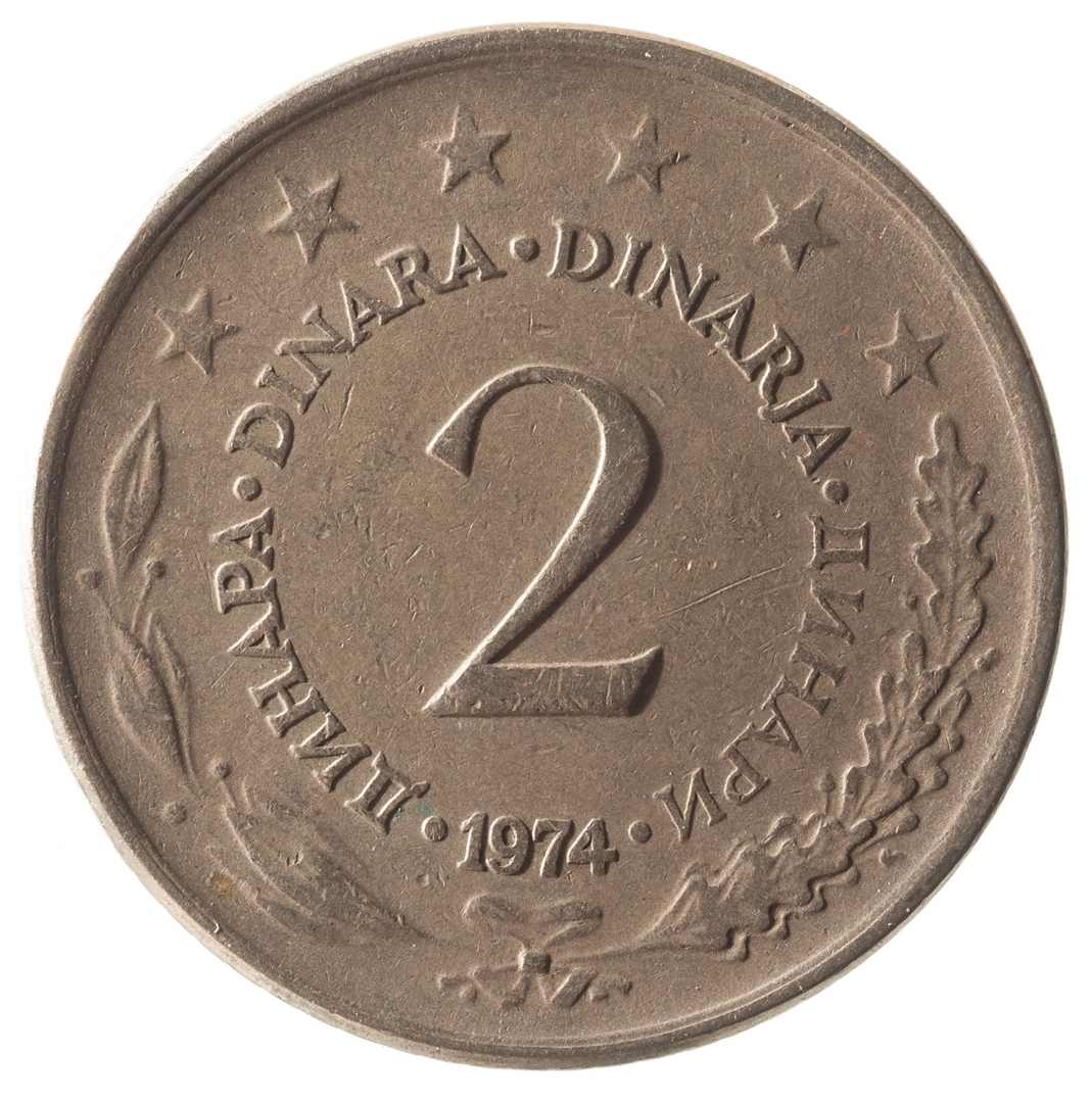 U sredini broj 2 (nominala), oko njega tekst DINAR na četiri jezika, a ispod toga godina 1974. Duž gornjeg ruba polukružno poredano 6 petokrakih zvjezdi.