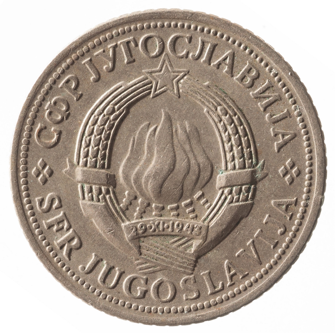 U sredini državni grb. U oko njega uz rub polukružno napisan tekst SFR JUGOSLAVIJA na latinici i ćirilici.