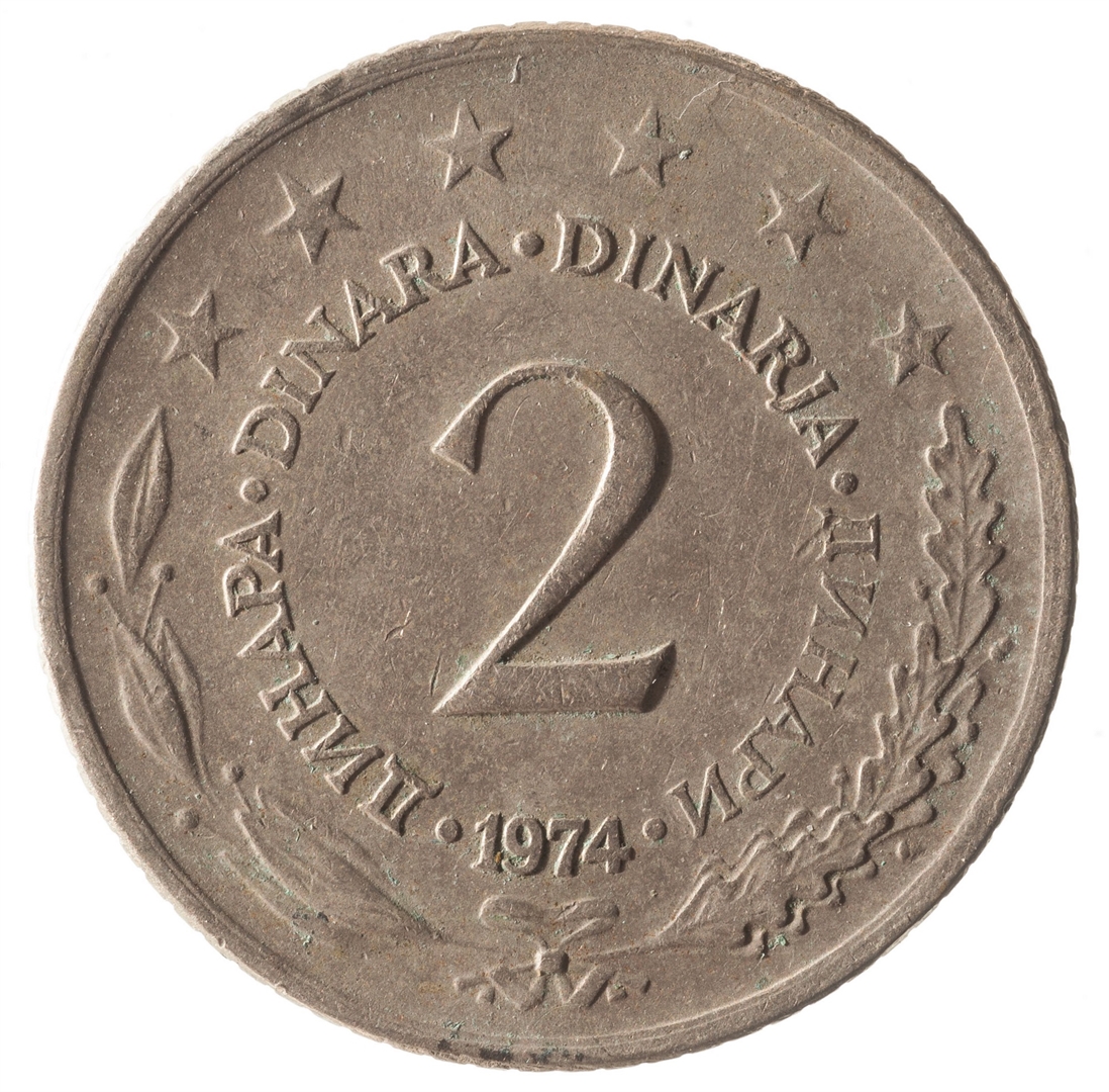 U sredini broj 2 (nominala), oko njega tekst DINAR na četiri jezika, a ispod toga godina 1974. Duž gornjeg ruba polukružno poredano 6 petokrakih zvjezdi.