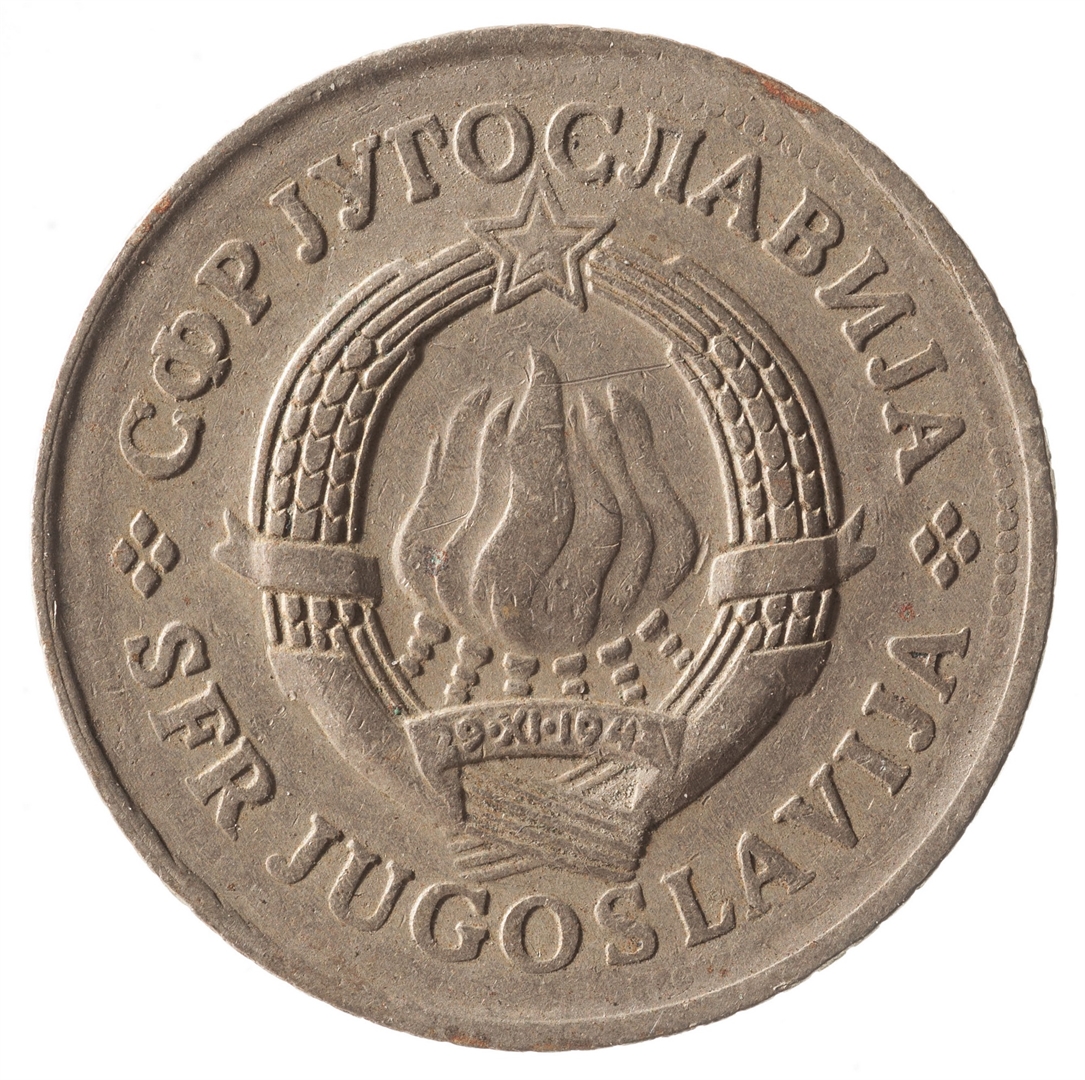U sredini državni grb. U oko njega uz rub polukružno napisan tekst SFR JUGOSLAVIJA na latinici i ćirilici.
