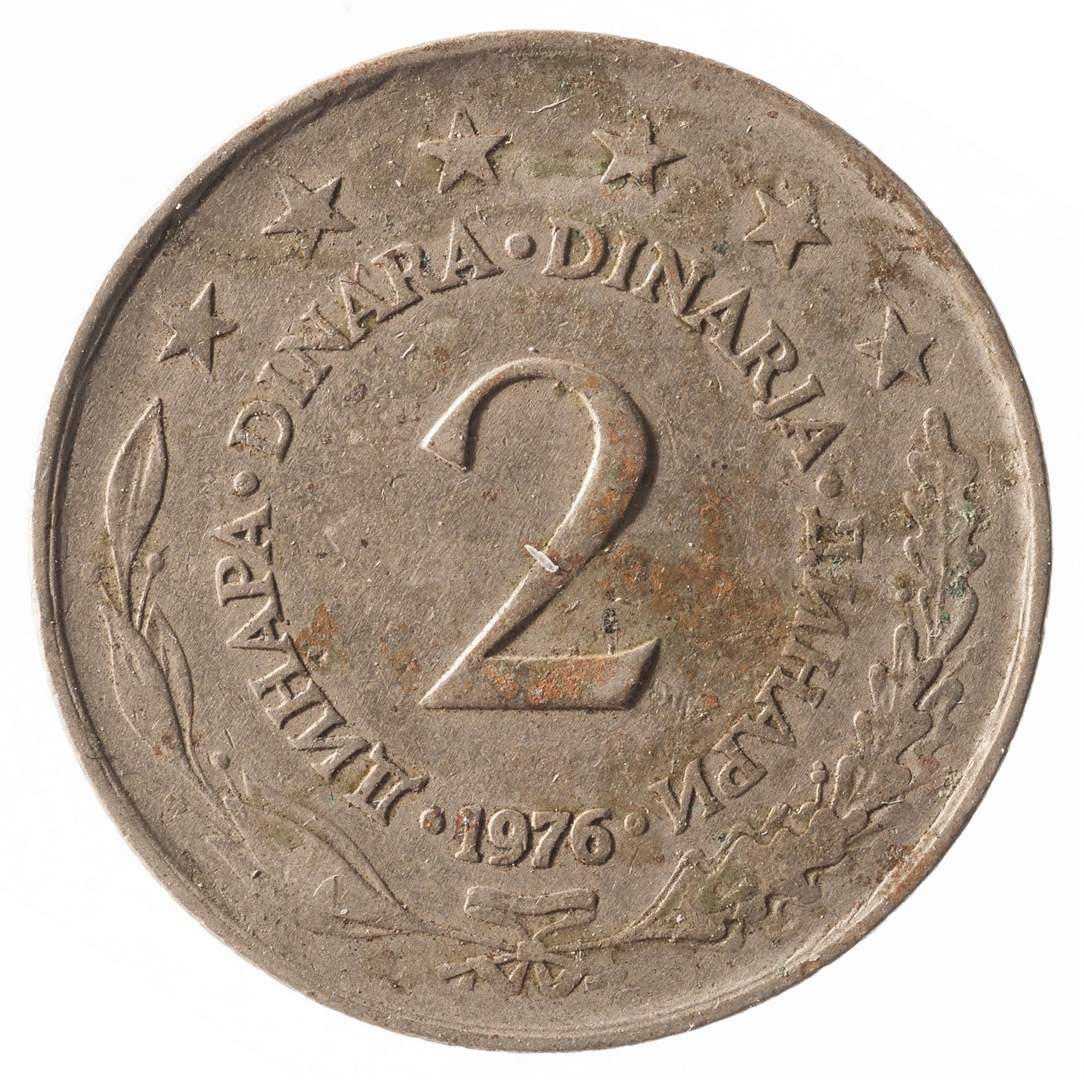 U sredini broj 2 (nominala), oko njega tekst DINAR na četiri jezika, a ispod toga godina 1976. Duž gornjeg ruba polukružno poredano 6 petokrakih zvjezdi.