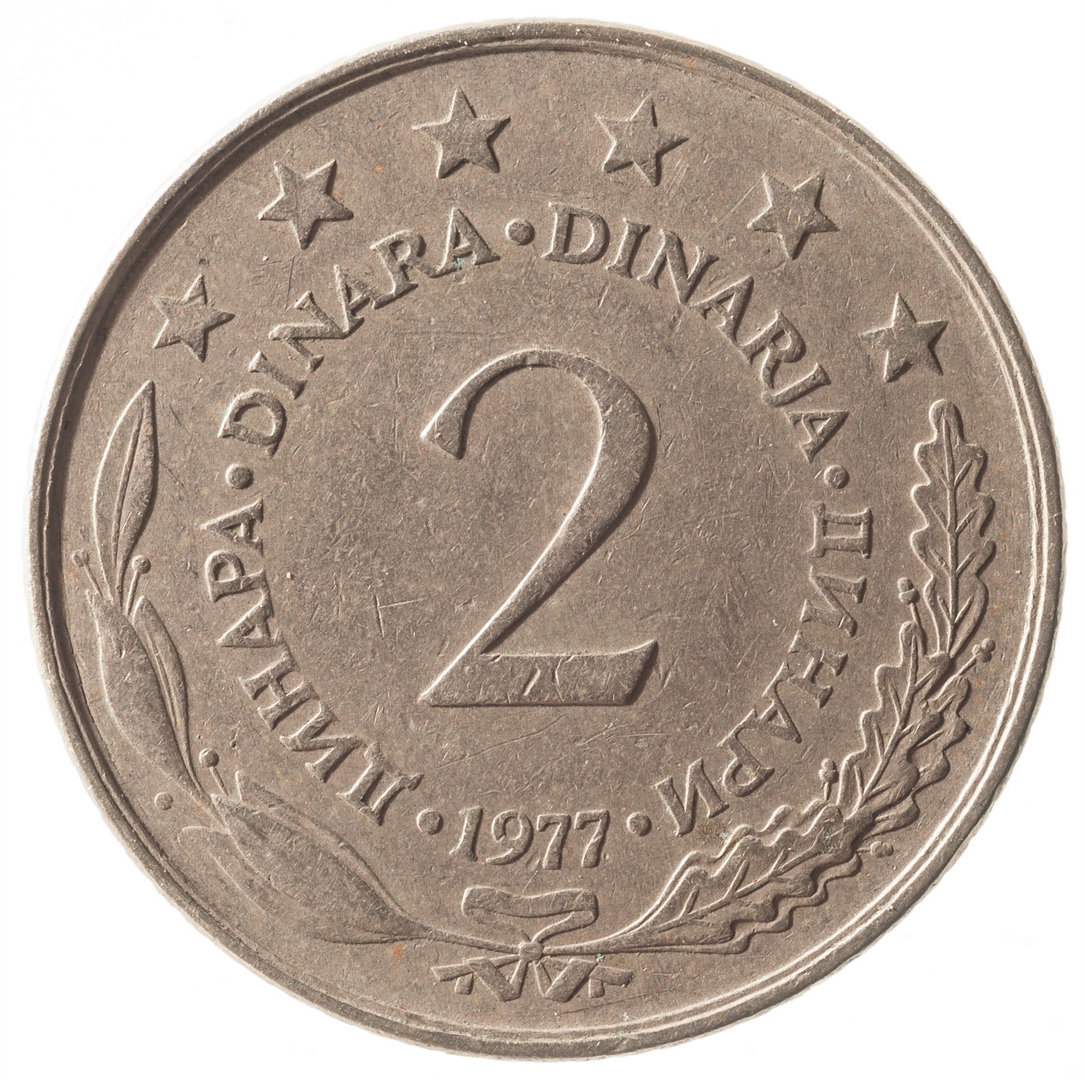U sredini broj 2 (nominala), oko njega tekst DINAR na četiri jezika, a ispod toga godina 1977. Duž gornjeg ruba polukružno poredano 6 petokrakih zvjezdi.
