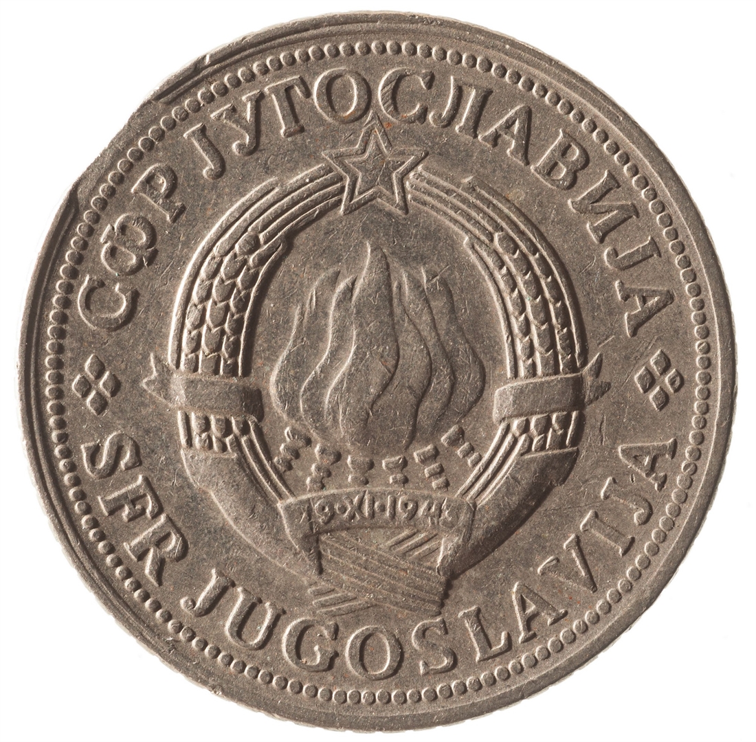 U sredini državni grb. U oko njega uz rub polukružno napisan tekst SFR JUGOSLAVIJA na latinici i ćirilici.