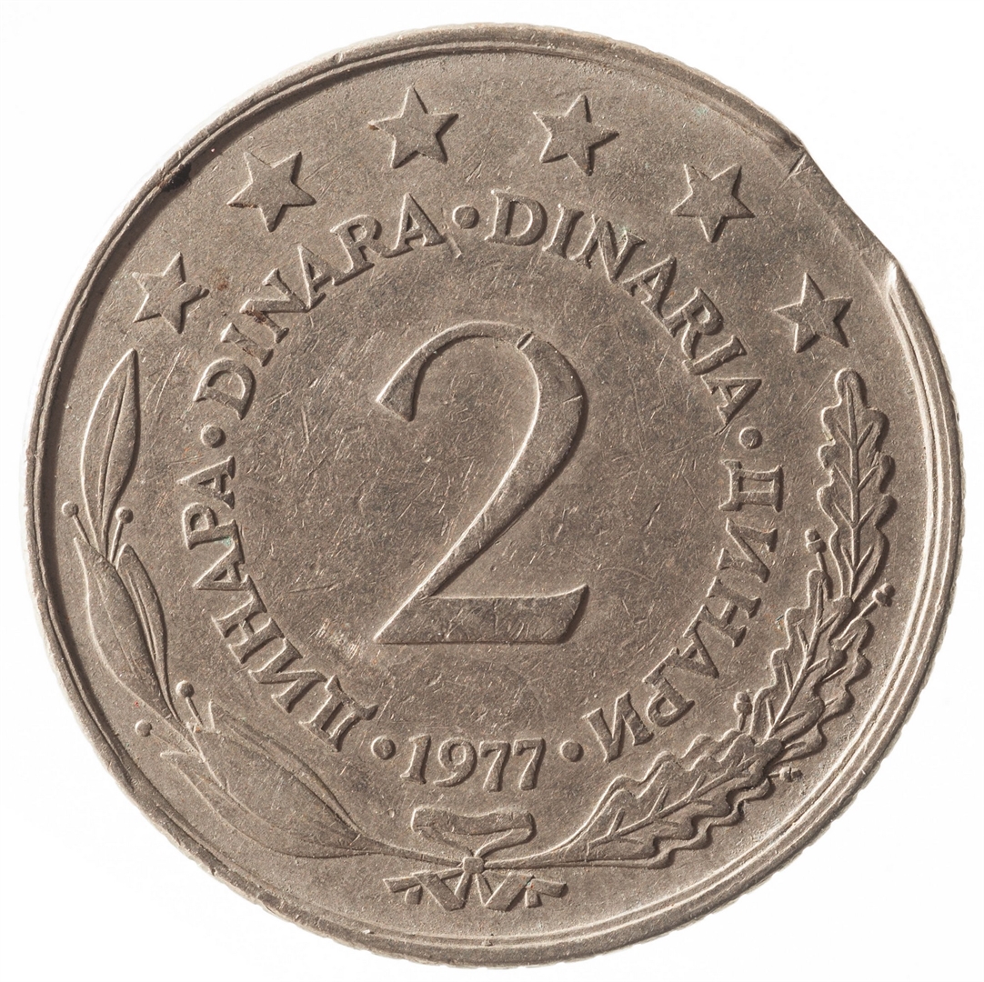 U sredini broj 2 (nominala), oko njega tekst DINAR na četiri jezika, a ispod toga godina 1977. Duž gornjeg ruba polukružno poredano 6 petokrakih zvjezdi.