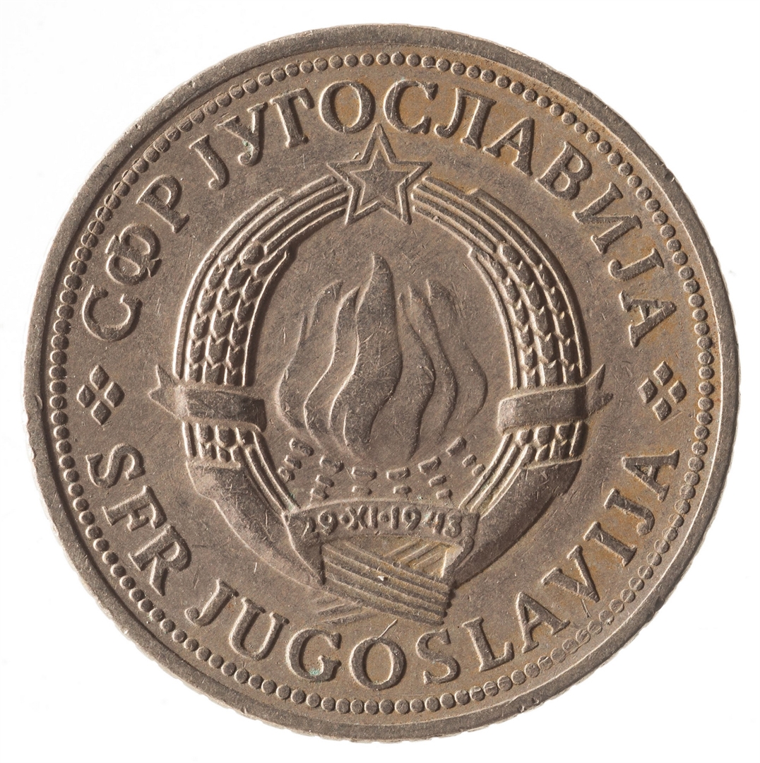 U sredini državni grb. U oko njega uz rub polukružno napisan tekst SFR JUGOSLAVIJA na latinici i ćirilici.