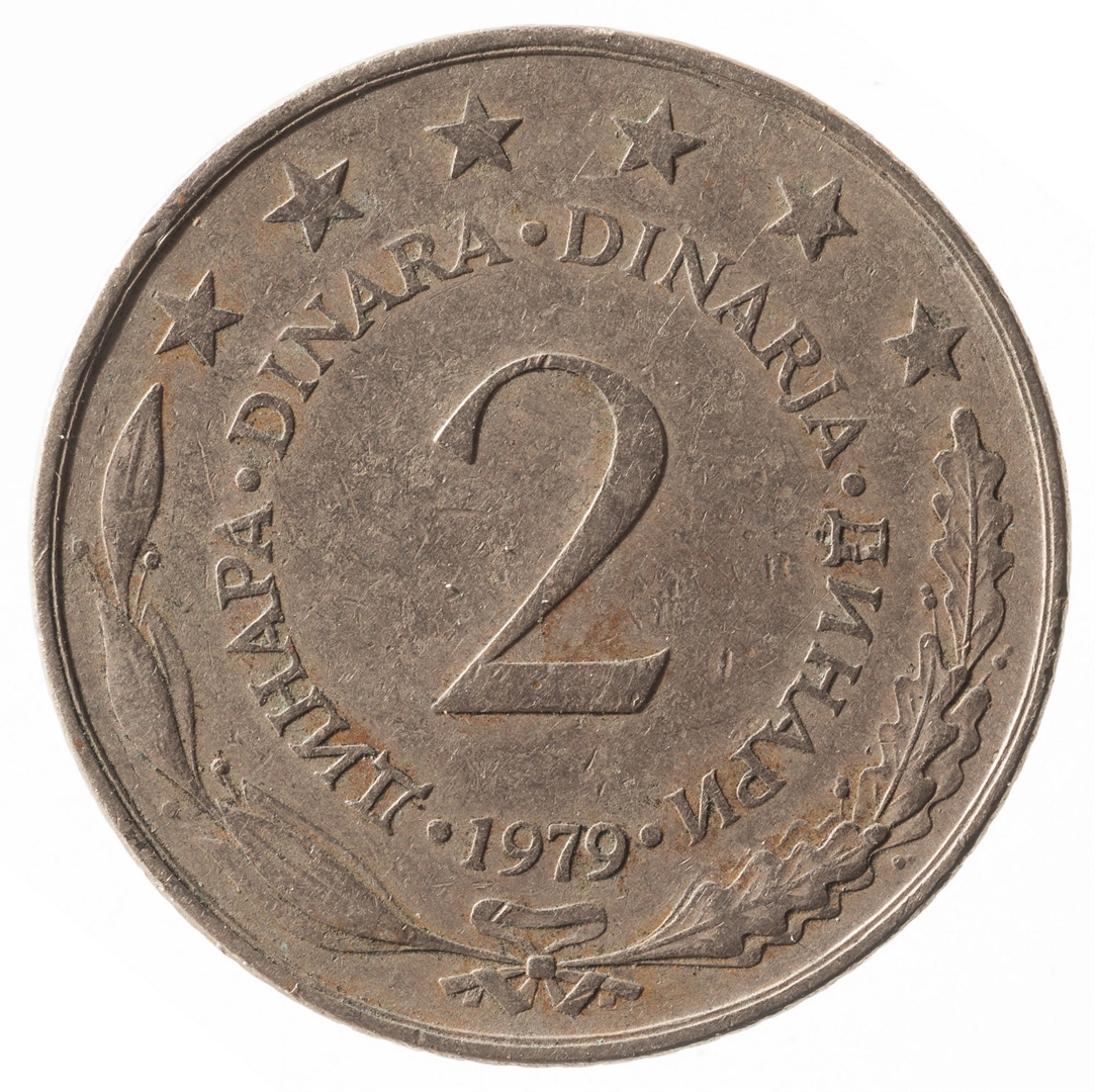 U sredini broj 2 (nominala), oko njega tekst DINAR na četiri jezika, a ispod toga godina 1979. Duž gornjeg ruba polukružno poredano 6 petokrakih zvjezdi.