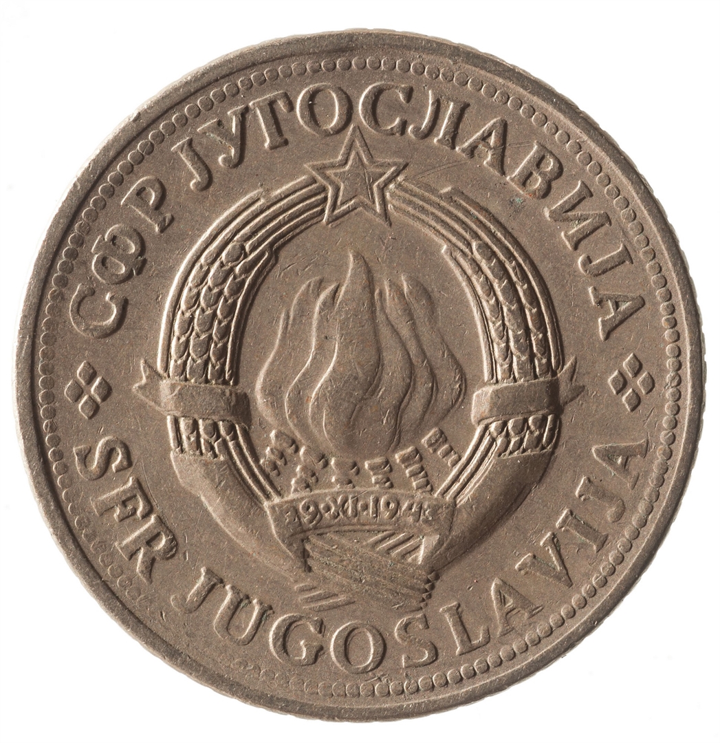 U sredini državni grb. U oko njega uz rub polukružno napisan tekst SFR JUGOSLAVIJA na latinici i ćirilici.