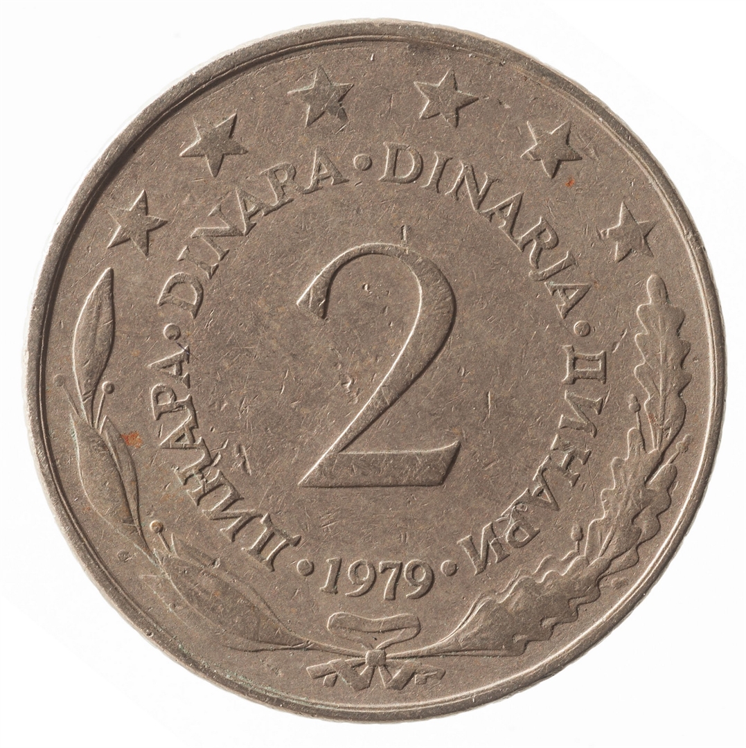 U sredini broj 2 (nominala), oko njega tekst DINAR na četiri jezika, a ispod toga godina 1979. Duž gornjeg ruba polukružno poredano 6 petokrakih zvjezdi.