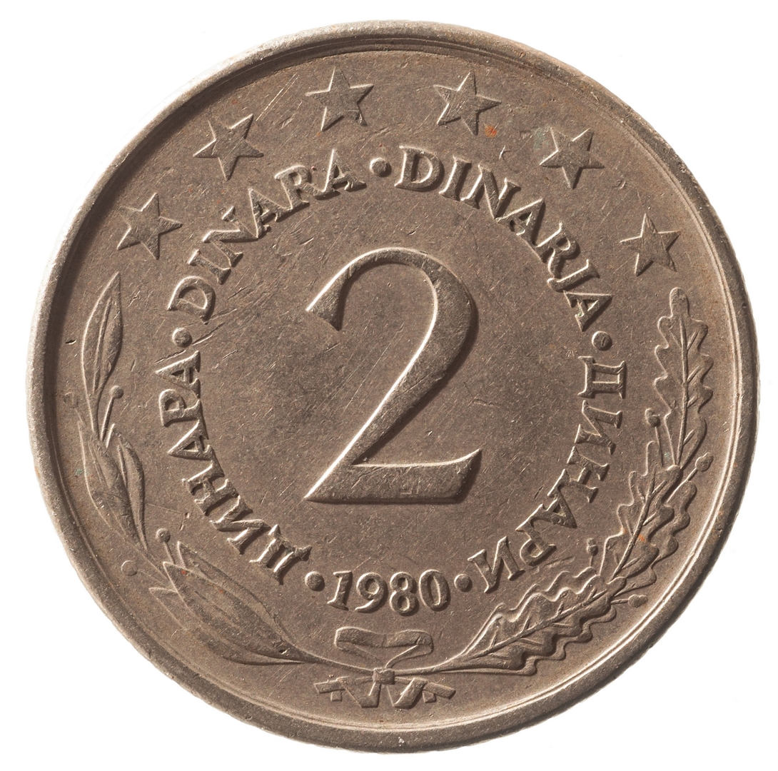 Avers: U sredini državni grb. U oko njega uz rub polukružno napisan tekst SFR JUGOSLAVIJA na latinici i ćirilici. Revers: U sredini broj 2 (nominala), oko njega tekst DINAR na četiri jezika, a ispod toga godina 1980. Duž gornjeg ruba polukružno poredano 6 petokrakih zvjezdi.