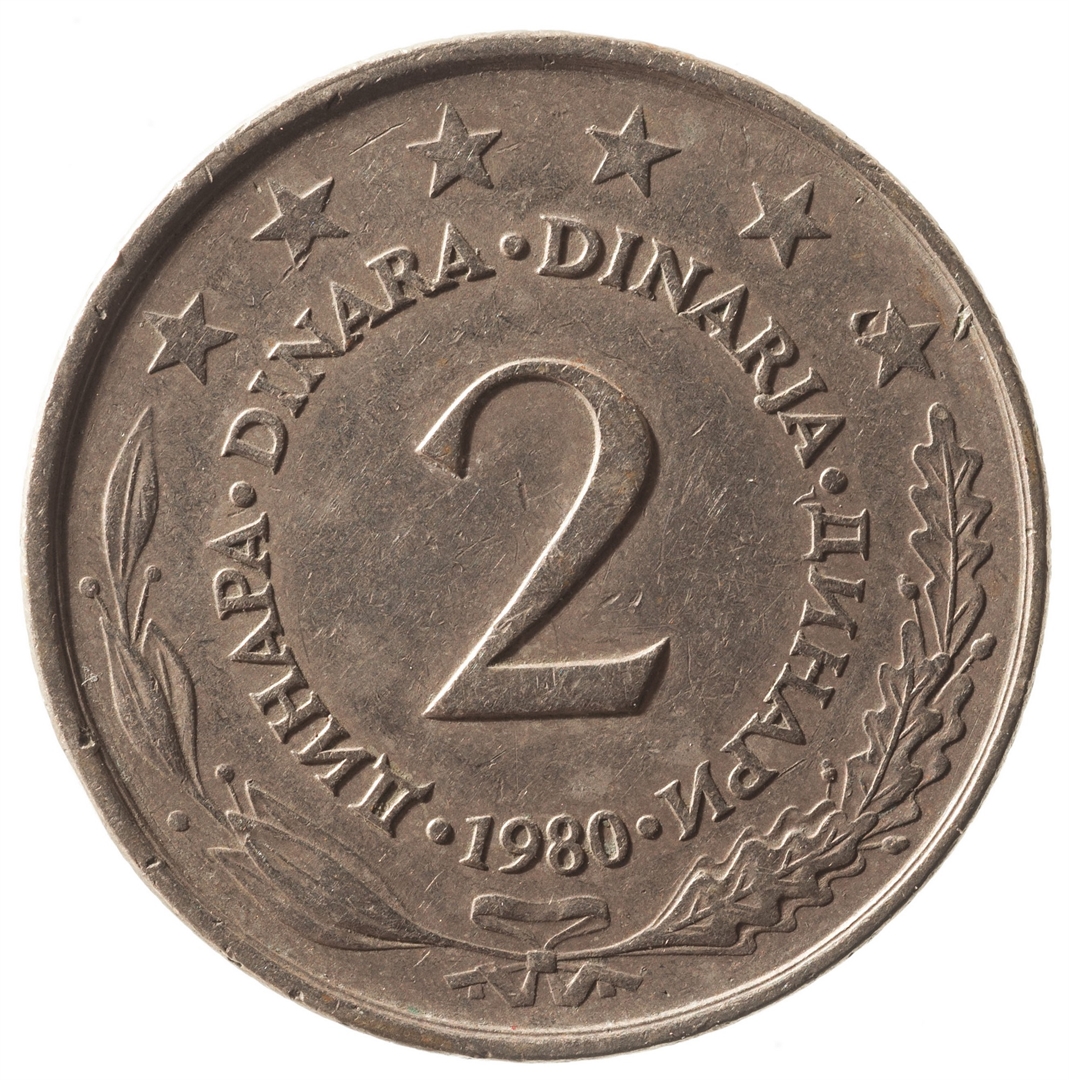 U sredini broj 2 (nominala), oko njega tekst DINAR na četiri jezika, a ispod toga godina 1980. Duž gornjeg ruba polukružno poredano 6 petokrakih zvjezdi.