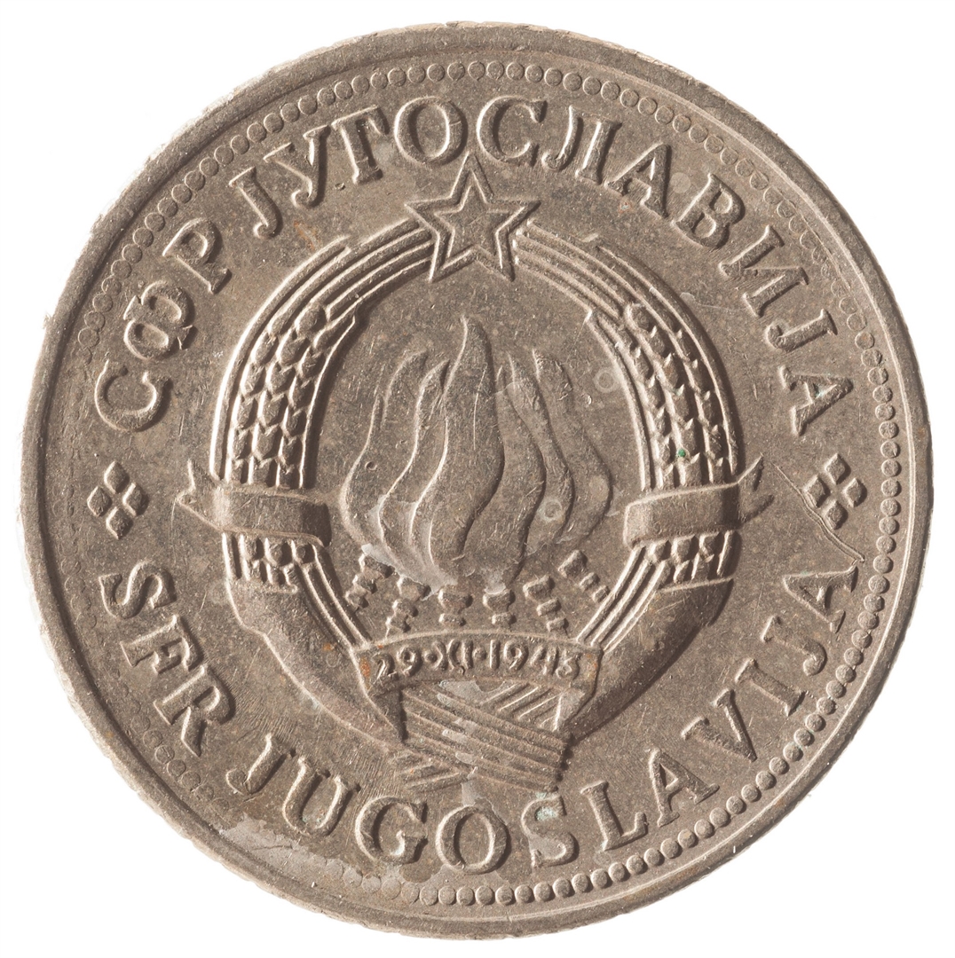 U sredini državni grb. U oko njega uz rub polukružno napisan tekst SFR JUGOSLAVIJA na latinici i ćirilici.