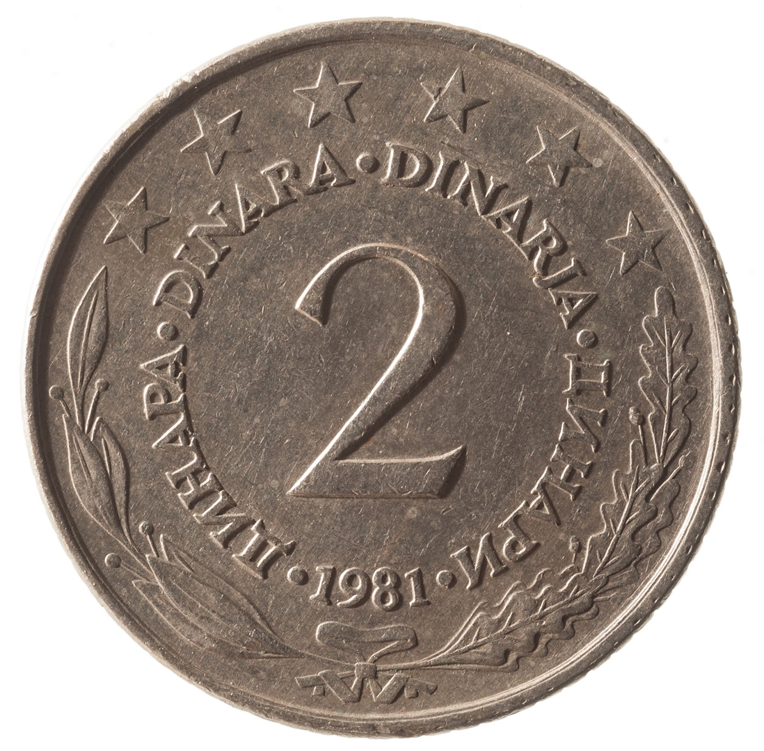 U sredini broj 2 (nominala), oko njega tekst DINAR na četiri jezika, a ispod toga godina 1981. Duž gornjeg ruba polukružno poredano 6 petokrakih zvjezdi.