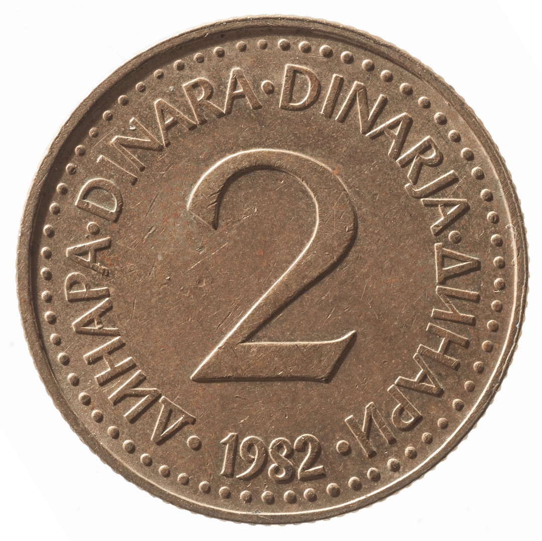 U sredini broj 2 (nominala), oko njega tekst DINAR na četiri jezika, a ispod toga godina 1982.