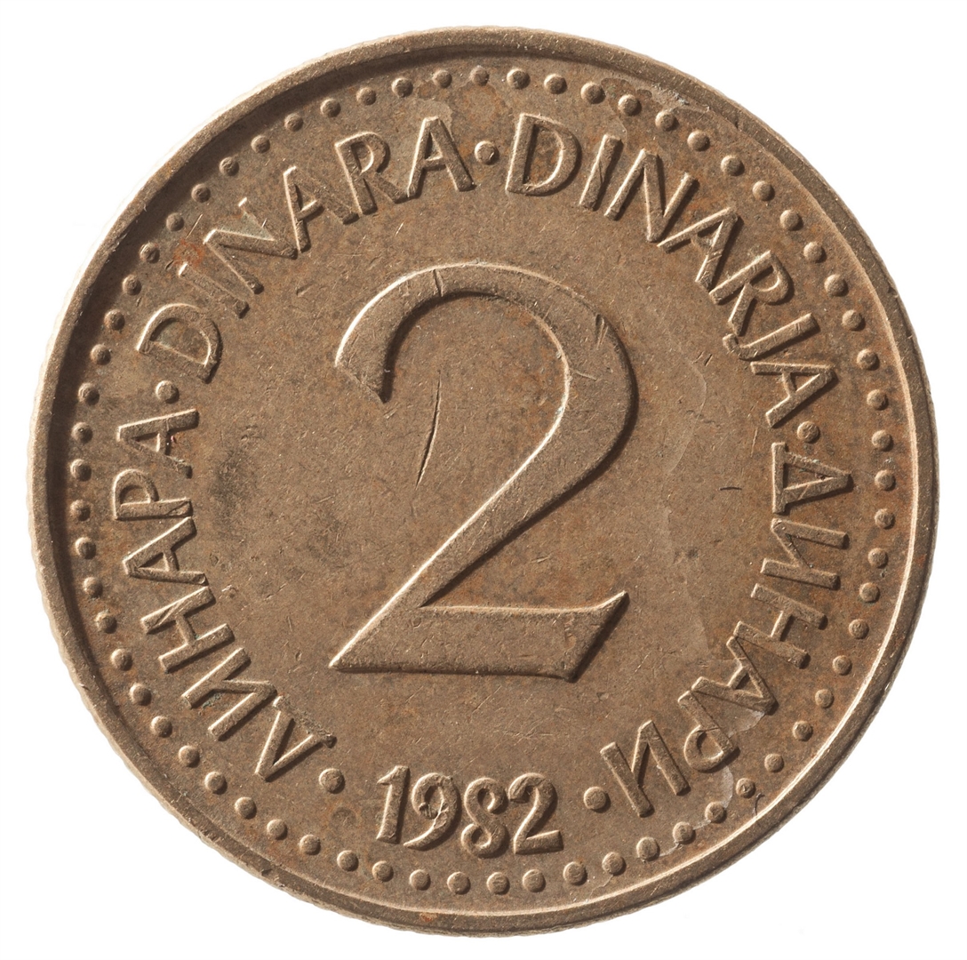 U sredini broj 2 (nominala), oko njega tekst DINAR na četiri jezika, a ispod toga godina 1982.
