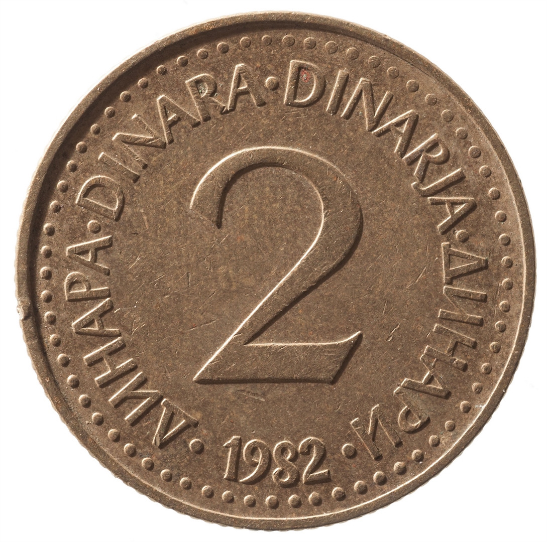 U sredini broj 2 (nominala), oko njega tekst DINAR na četiri jezika, a ispod toga godina 1982.