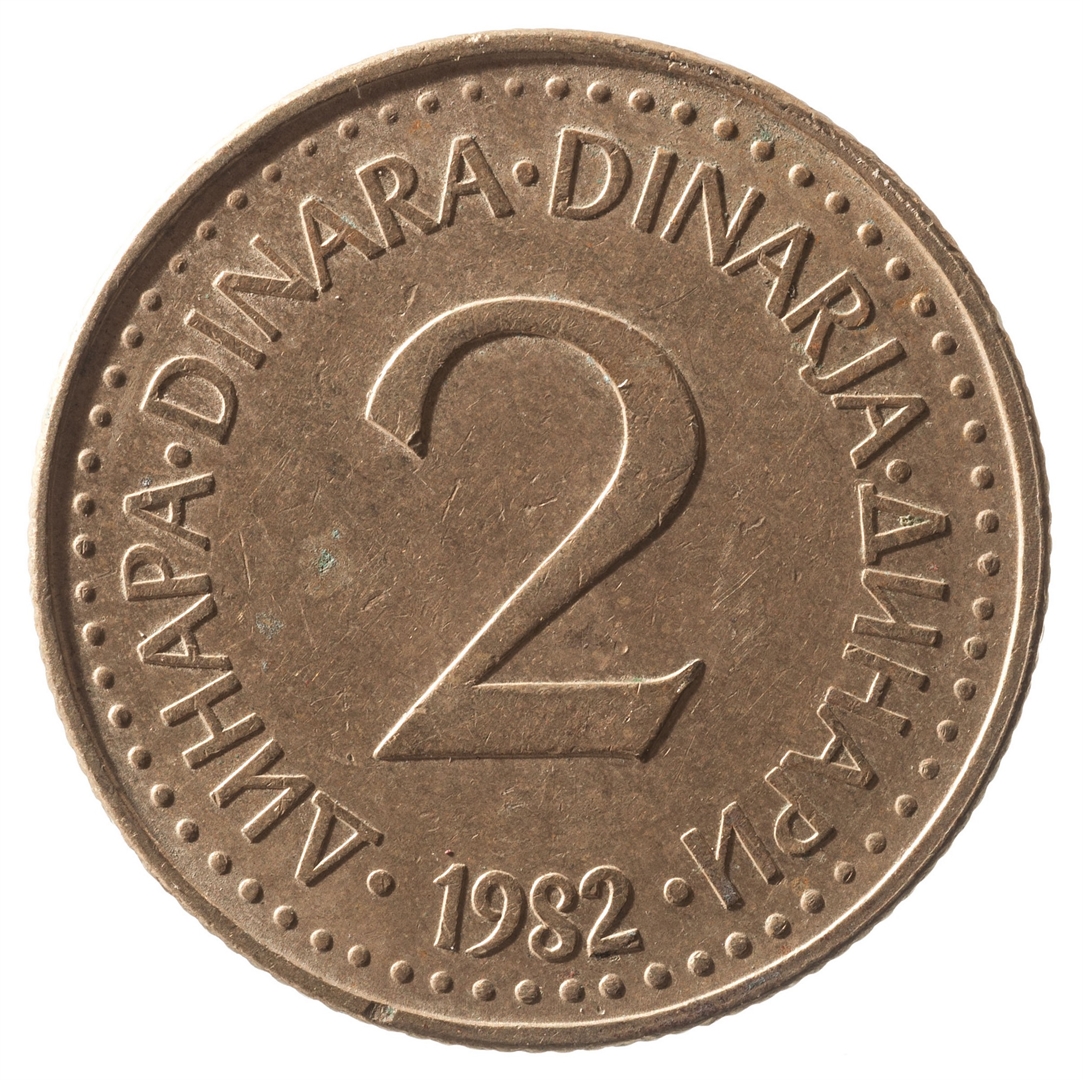 U sredini broj 2 (nominala), oko njega tekst DINAR na četiri jezika, a ispod toga godina 1982.