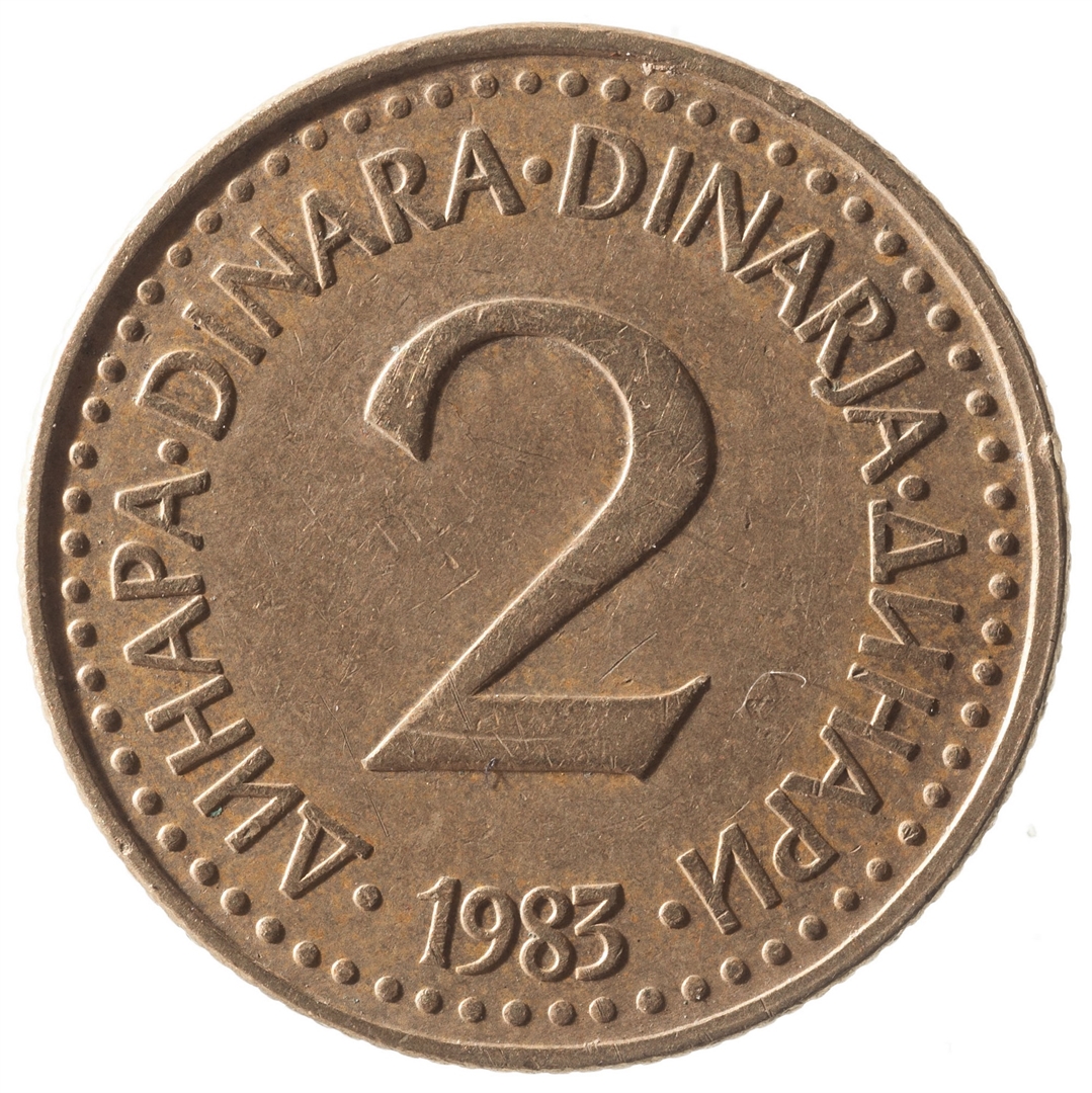 U sredini broj 2 (nominala), oko njega tekst DINAR na četiri jezika, a ispod toga godina 1983.