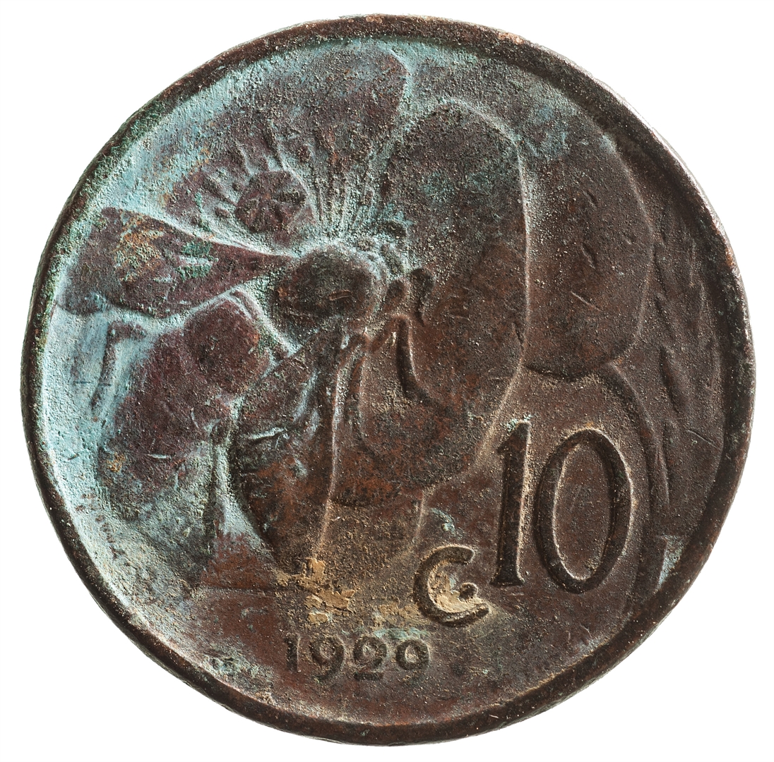 Avers: Centralni dio kovanice zauzima profil muške osobe sa pogledom u lijevo. Kružno uz rub kovanice proteže se natpis VITTORIO. EMANUELE. III. RE. D''ITALIA. Na dnu uz rub kovanice nalazi se natpis A. MOTTI. Revers: Dvije trećine površine zauzima prikaz pčele na cvijetu. Uz desni doljnji rub kovanice nalazi se natpis c10, a uz lijevi donji rub veliko slovo R. Na samon dnu nalazi se godina 1929.