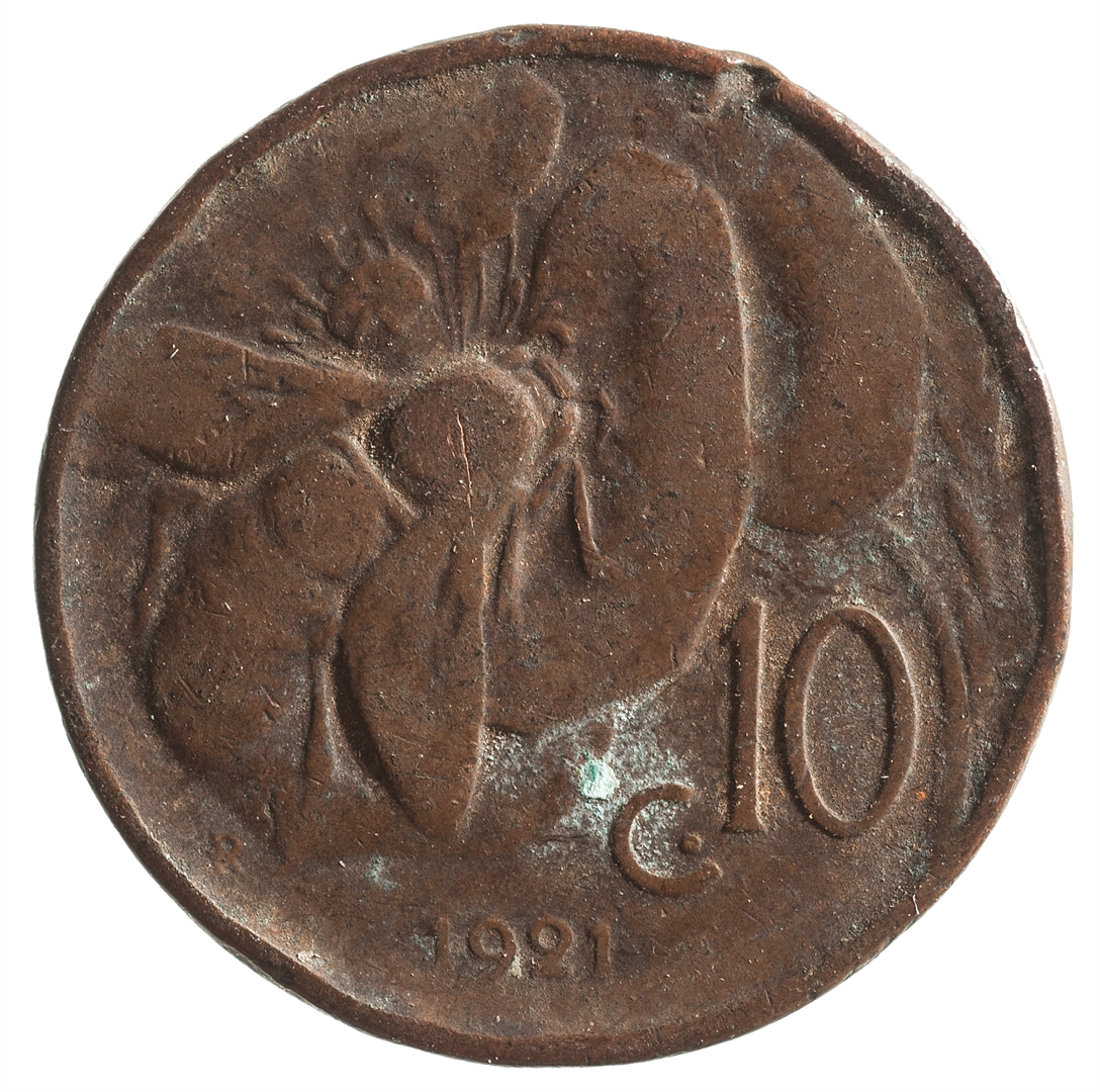 Dvije trećine površine zauzima prikaz pčele na cvijetu. Uz desni doljnji rub kovanice nalazi se natpis c10, a uz lijevi donji rub veliko slovo R. Na samon dnu nalazi se godina 1921.