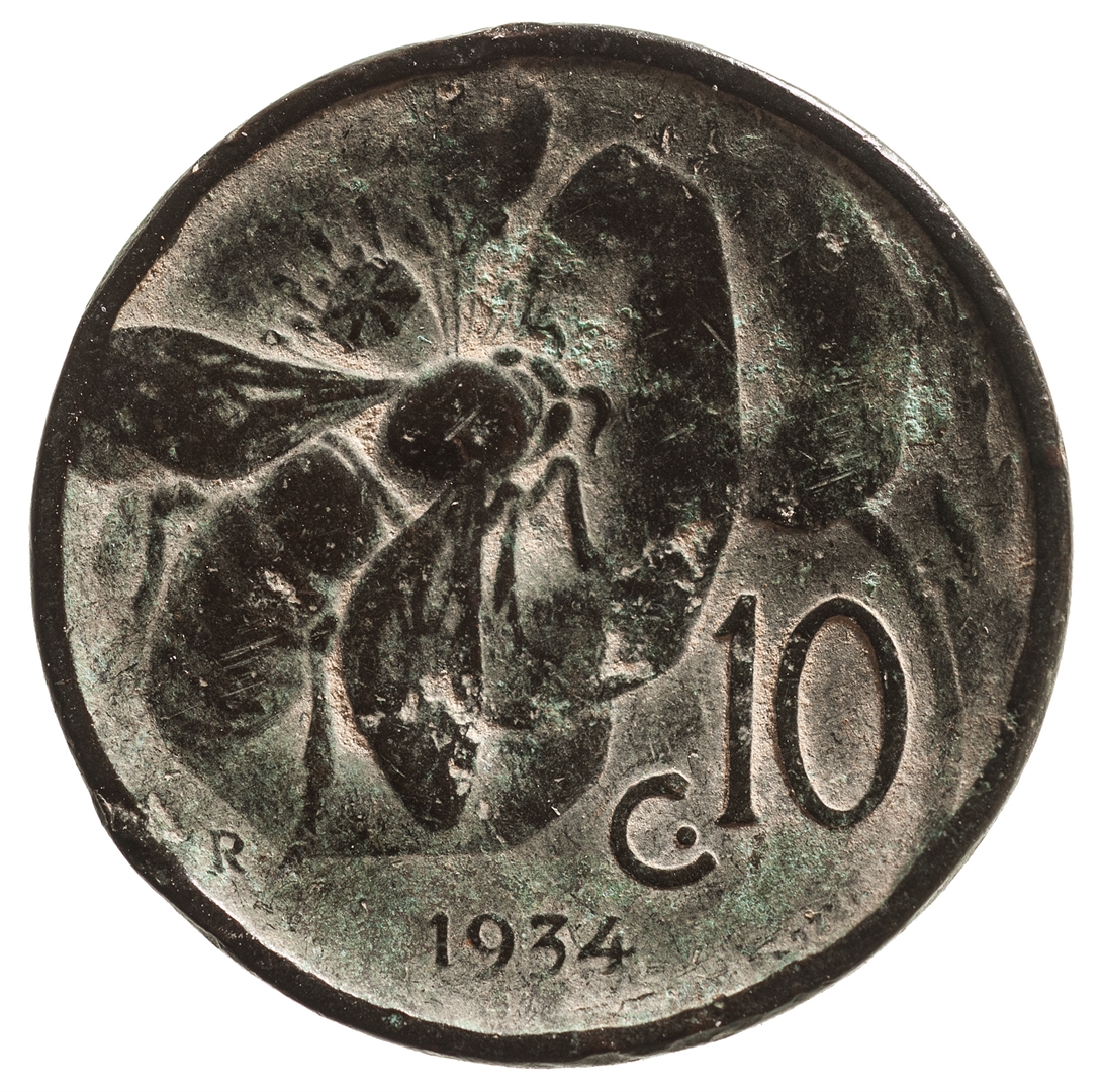 Avers: Centralni dio kovanice zauzima profil muške osobe sa pogledom u lijevo. Kružno uz rub kovanice proteže se natpis VITTORIO. EMANUELE. III. RE. D''ITALIA. Na dnu uz rub kovanice nalazi se natpis A. MOTTI. Revers: Dvije trećine površine zauzima prikaz pčele na cvijetu. Uz desni doljnji rub kovanice nalazi se natpis c10, a uz lijevi donji rub veliko slovo R. Na samon dnu nalazi se godina 1934.