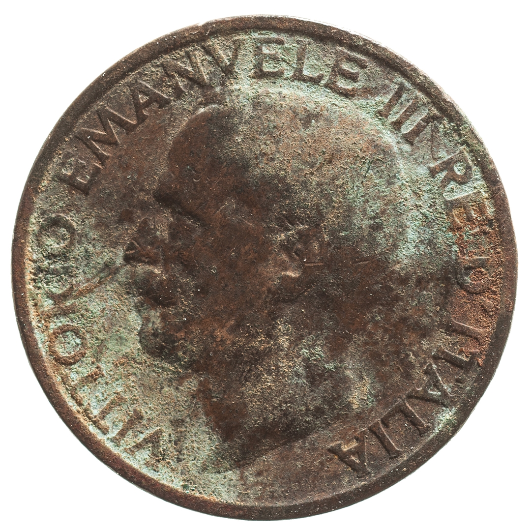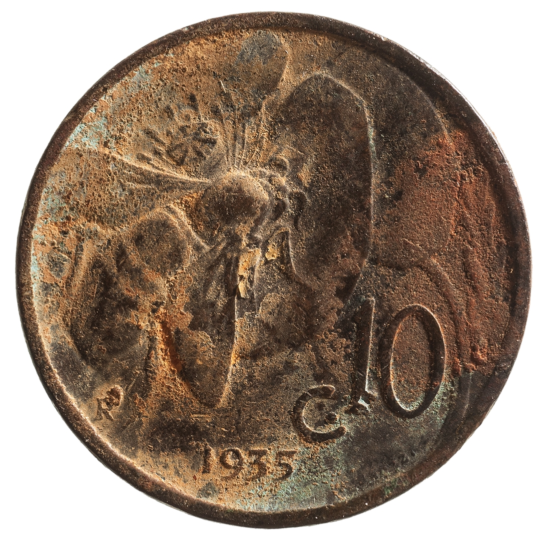 Avers: Centralni dio kovanice zauzima profil muške osobe sa pogledom u lijevo. Kružno uz rub kovanice proteže se natpis VITTORIO. EMANUELE. III. RE. D''ITALIA. Na dnu uz rub kovanice nalazi se natpis A. MOTTI. Revers: Dvije trećine površine zauzima prikaz pčele na cvijetu. Uz desni doljnji rub kovanice nalazi se natpis c10, a uz lijevi donji rub veliko slovo R. Na samon dnu nalazi se godina 1935.