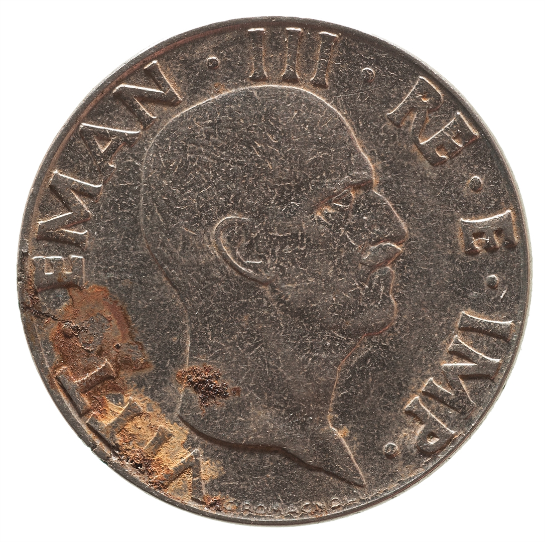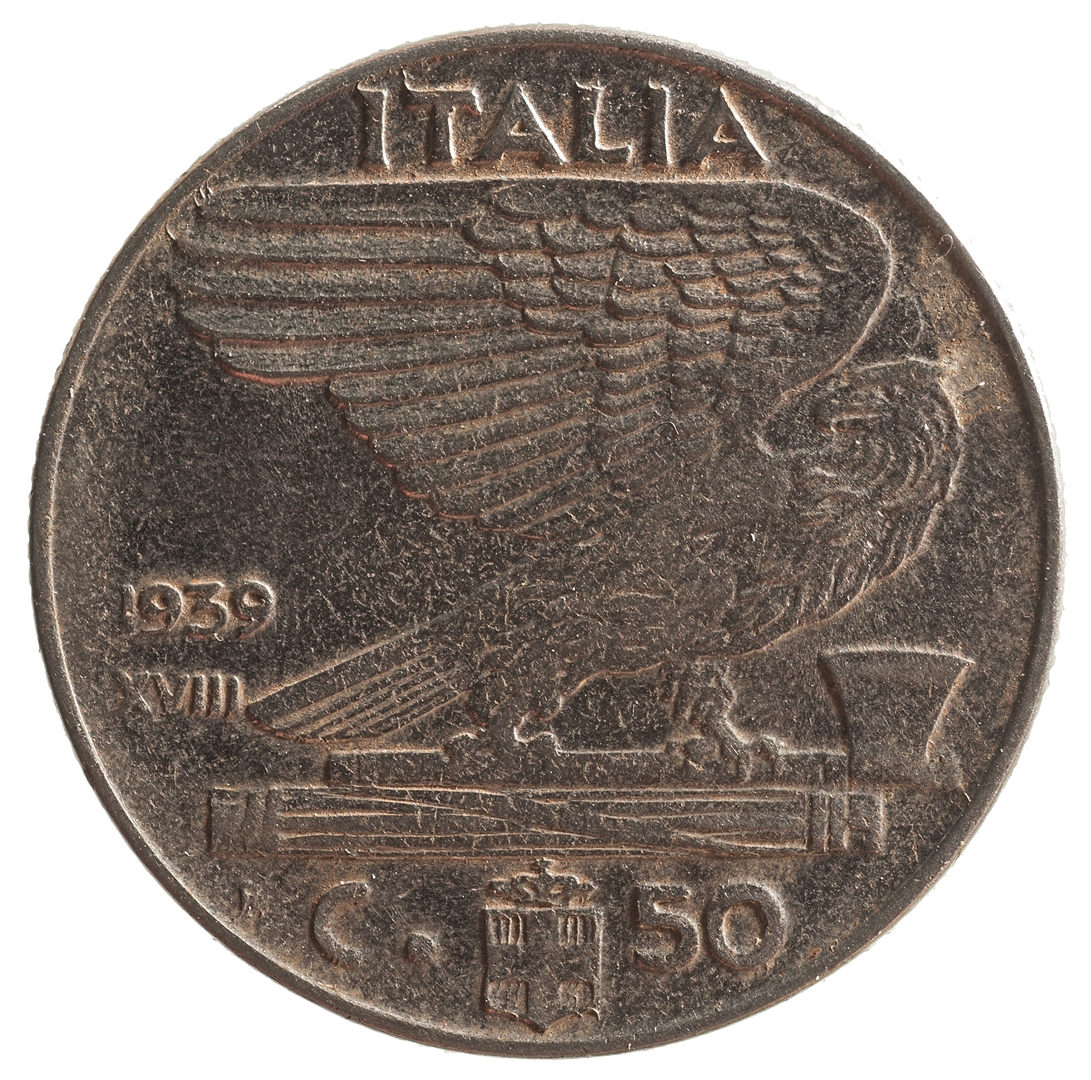 Avers: Centralni dio kovanice zauzima profil muške osobe sa pogledom u desno. Kružno uz rub kovanice proteže se natpis VITT. EMAN. III. RE. E. IMP.. Na dnu uz rub nalazi se natpis G.ROMAGNOLI. Revers: Centralni dio reversa zauzima prikaz orla raširenih krila koji u kanđama drži fascio. Iznad njega nalazi se natpis ITALIA, a sa njegove desne strane godina 1939 i rimski broj XVIII. U dnu na sredini nalazi se grb s čije se desne strane nalazi broj 50, a sa lijeve strane slovo C. Lijevo od slova C nalazi se malo slovo R.