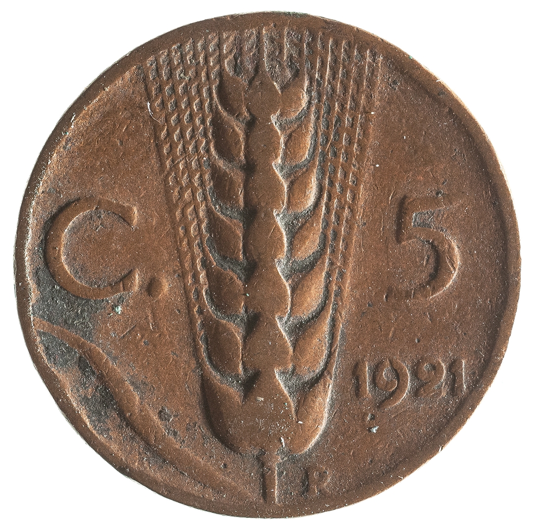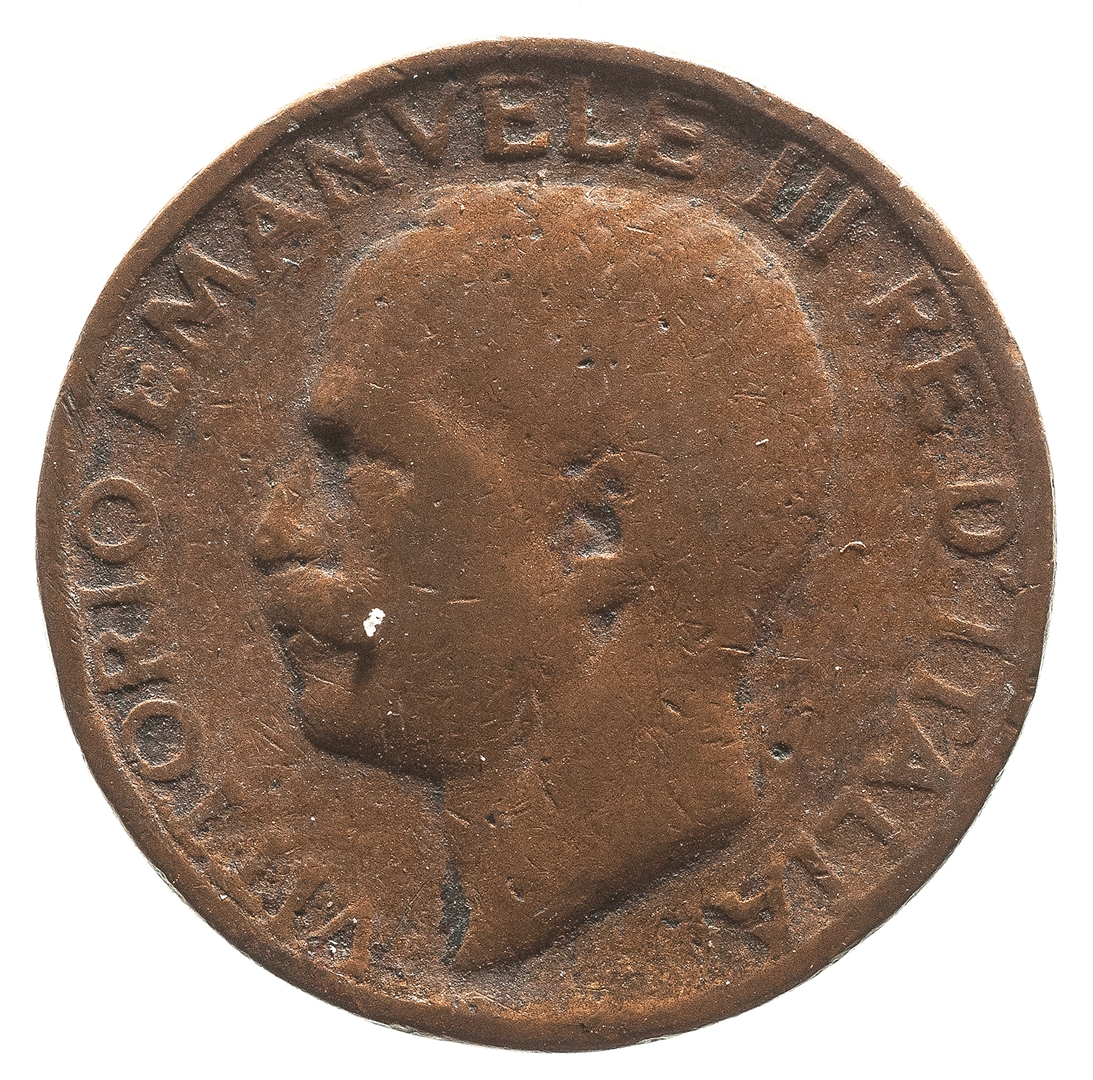 Centralni dio kovanice zauzima profil muške osobe sa pogledom u lijevo. Kružno uz rub kovanice proteže se natpis VITTORIO. EMANUELE. III. RE. D''ITALIA. Na dnu uz rub kovanice nalazi se natpis A. MOTTI.
