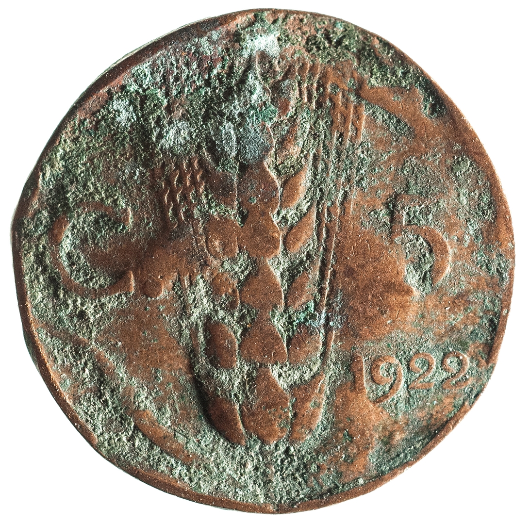 Centralni dio kovanice zauzima profil muške osobe sa pogledom u lijevo. Kružno uz rub kovanice proteže se natpis VITTORIO. EMANUELE. III. RE. D''ITALIA. Na dnu uz rub kovanice nalazi se natpis A. MOTTI.