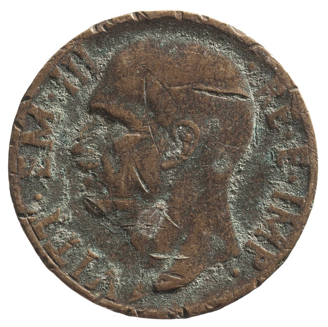 Centralni dio kovanice zauzima profil osobe sa pogledom u lijevo. Kružno uz rub kovanice proteže se natpis VITT. EMAN. III. RE. E. IMP.