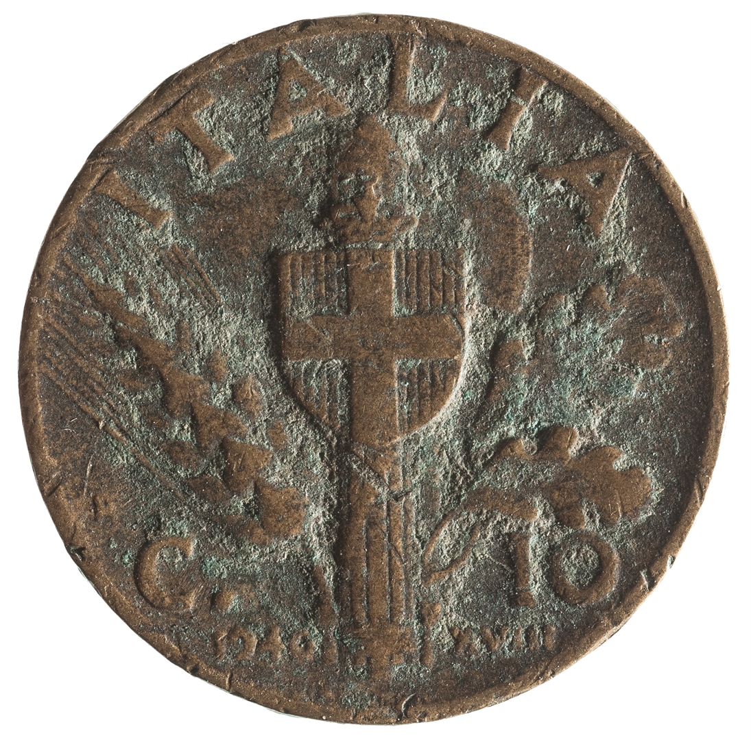 Centralno mjesto na kovanici zauzima fascio sa grbom. Iznad njega polukružno uz rub nalazi se natpis ITALIA, sa njegove lijeve strane smjestio se klas žita, a sa desne dva hrastova lista. Na dnu sa lijeve strane fascia nalazi se godina 1940., a sa njegove desne strane rimski broj XVIII.