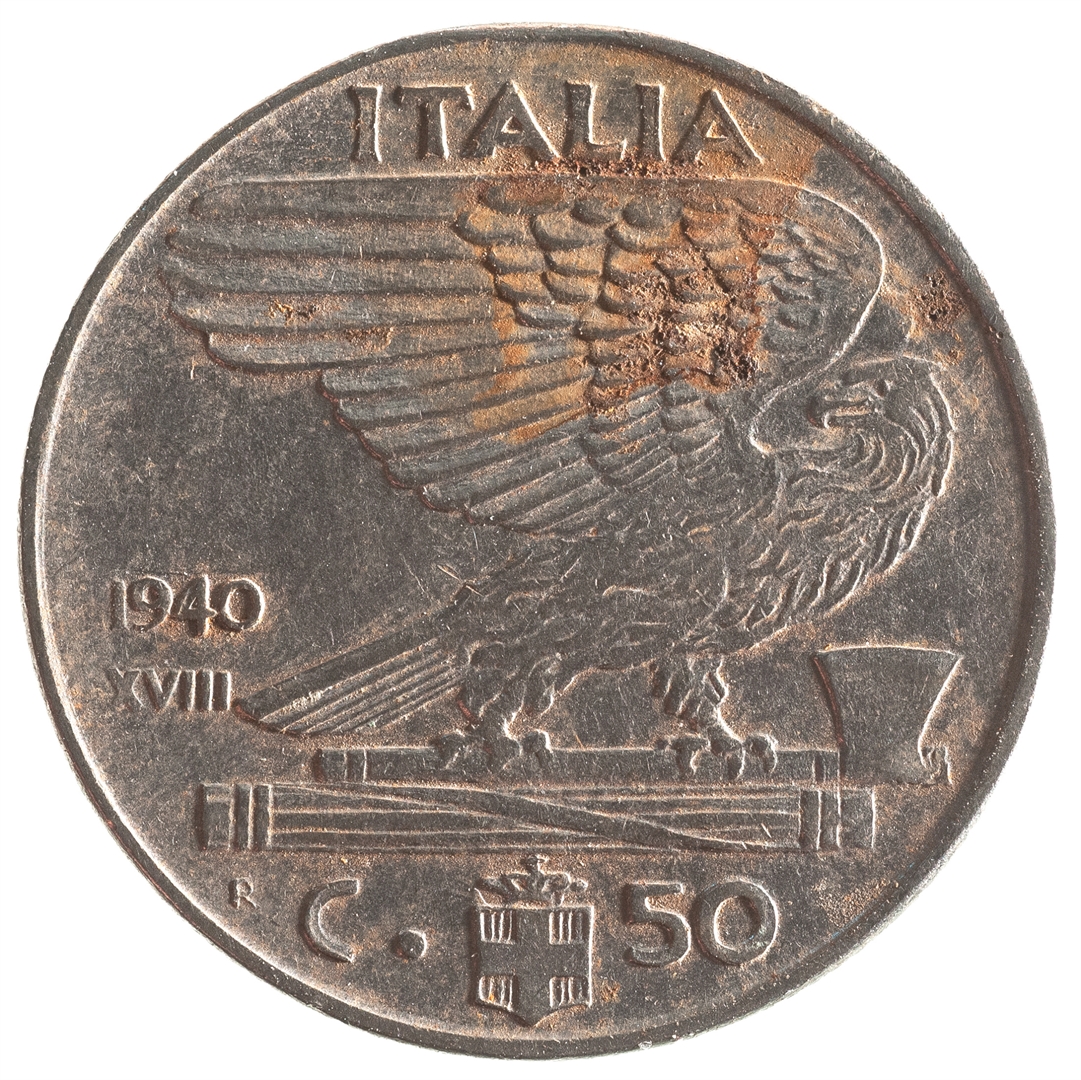 Centralni dio reversa zauzima prikaz orla raširenih krila koji u kanđama drži fascio. Iznad njega nalazi se natpis ITALIA, a sa njegove desne strane godina 1940 i rimski broj XVIII. U dnu na sredini nalazi se grb s čije se desne strane nalazi broj 50, a sa lijeve strane slovo C. Lijevo od slova C nalazi se malo slovo R.