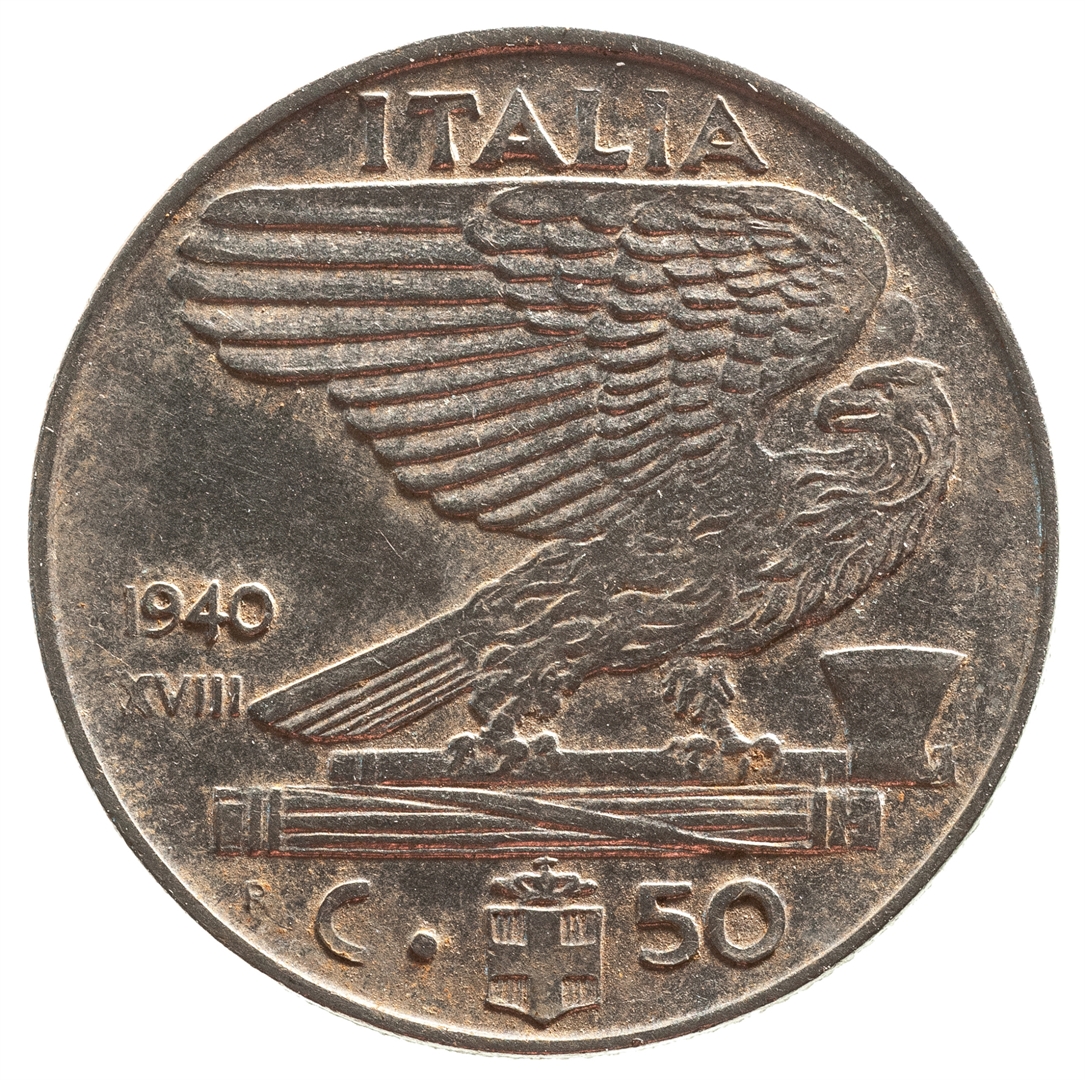 Centralni dio reversa zauzima prikaz orla raširenih krila koji u kanđama drži fascio. Iznad njega nalazi se natpis ITALIA, a sa njegove desne strane godina 1940 i rimski broj XVIII. U dnu na sredini nalazi se grb s čije se desne strane nalazi broj 50, a sa lijeve strane slovo C. Lijevo od slova C nalazi se malo slovo R.