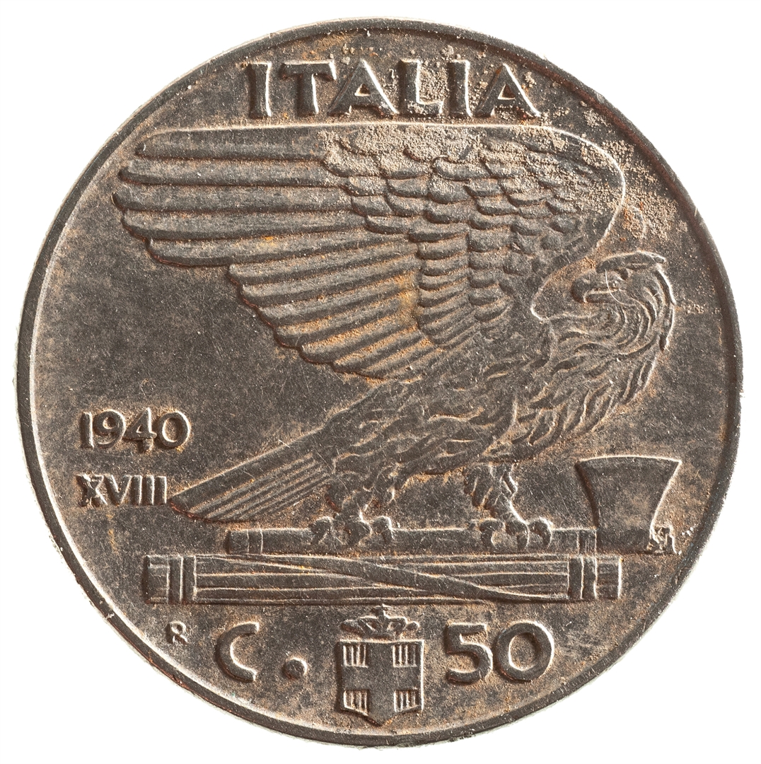 Centralni dio reversa zauzima prikaz orla raširenih krila koji u kanđama drži fascio. Iznad njega nalazi se natpis ITALIA, a sa njegove desne strane godina 1940 i rimski broj XVIII. U dnu na sredini nalazi se grb s čije se desne strane nalazi broj 50, a sa lijeve strane slovo C. Lijevo od slova C nalazi se malo slovo R.