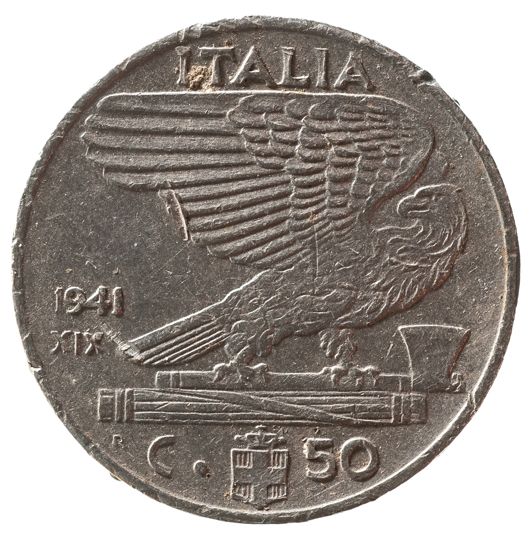 Centralni dio reversa zauzima prikaz orla raširenih krila koji u kanđama drži fascio. Iznad njega nalazi se natpis ITALIA, a sa njegove desne strane godina 1941 i rimski broj XIX. U dnu na sredini nalazi se grb s čije se desne strane nalazi broj 50, a sa lijeve strane slovo C. Lijevo od slova C nalazi se malo slovo R.